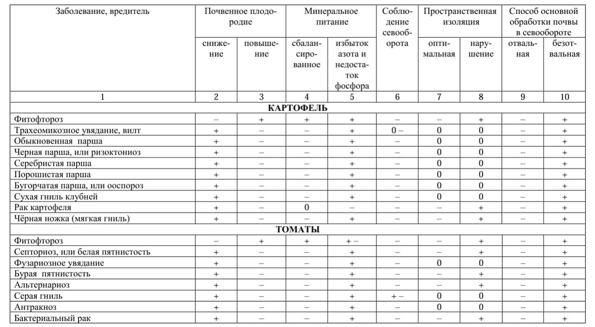 Влияние агротехнических приемов на вредоносность основных болезней картофеля и томата 🥔🍅 "+" - вредоносность повышается; "–" - вредоносность снижается; "0" - не оказывает влияния. Данные Э.А. Пикушовой, Е.Ю. Веретельник, В.С. Горьковенко.