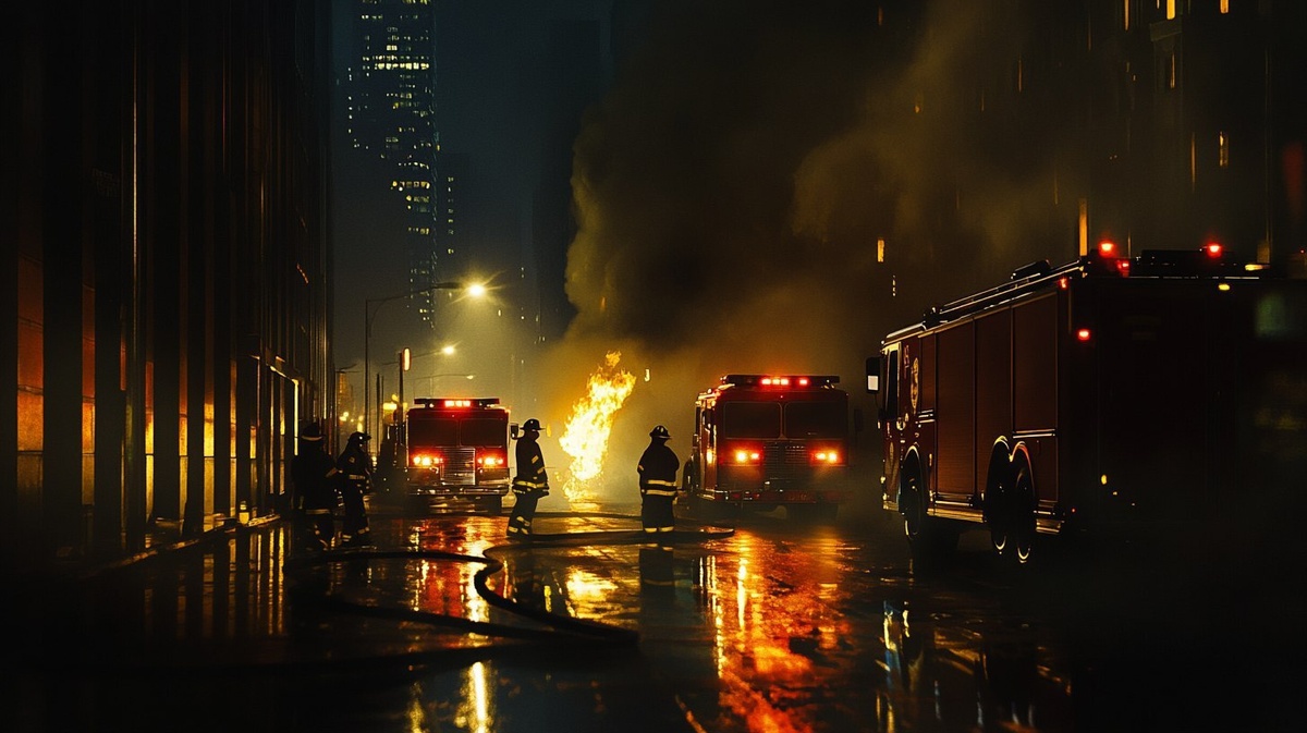 Создано на основе запроса: Nighttime urban scene with small localized fire, firefighters calmly working, smoke rising gently, soft glow of