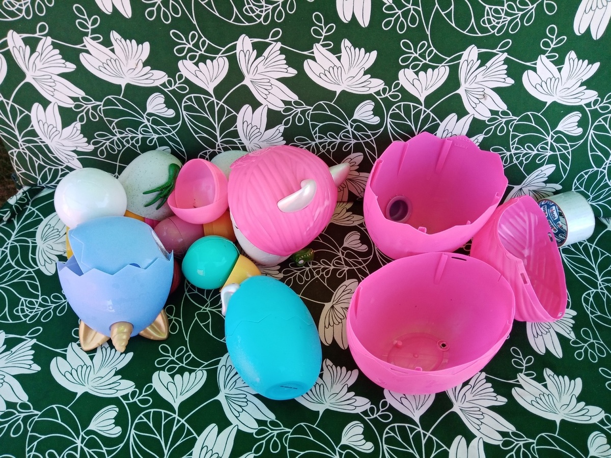 Целый год я собираю и храню в гараже большой пакет пластиковых упаковок, по форме напоминающих яйца. А всё потому, что три или четыре года назад услышал про игру "Поиск пасхальных яиц". Игра связана с традицией других стран раскладывать детям шоколадные яйца в саду. Я традицию изменил "под себя". У нас дети собирают сувениры и угощения, запакованные в пластиковые контейнеры. Вот такие: Тут упаковка и от больших киндеров, и от игрушек. Обычно такие выбрасывают после распаковки. Мы же яркие упаковки не выбрасываем, а складируем в гараже. За несколько лет накопилось 20 штук. В этом году вспомнили об этой игре накануне праздника, поэтому быстро и с минимальными затратами купил в магазине фиксированных цен недорогие подарочки и сладости. Плюс пара поделок. Игру делал для дочки и её двоюродной сестры. Паковал всё минут за тридцать до того, как дочь вышла на улицу и пришла племянница. Хорошо, что помощник у меня был отличный) Получилось 20 сюрпризов. В самые маленькие контейнеры положил по