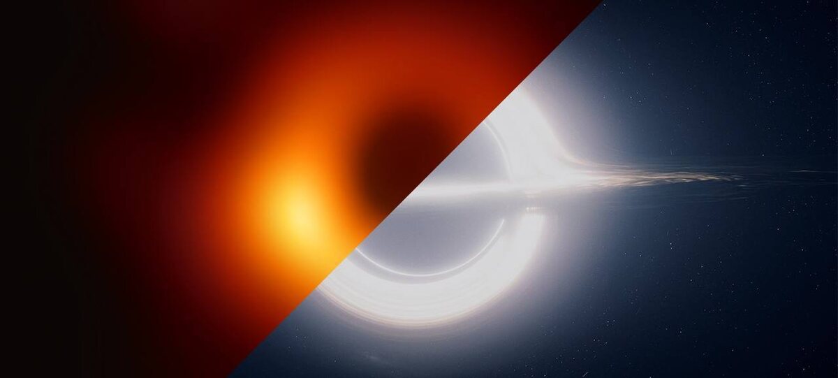 Сравнение реальной фотографии чёрной дыры и из фильма В фильме Интерстеллар, который вышел в 2014 году, была показана чёрная дыра, как бы она могла выглядеть на самом деле. И только в 2019 году учёные смогли получить первую в истории человечества фотографию чёрной дыры в центре галактики Messier 87 (M87) в созвездие девы. Она точь в точь схожа с той, что показана в фильме.