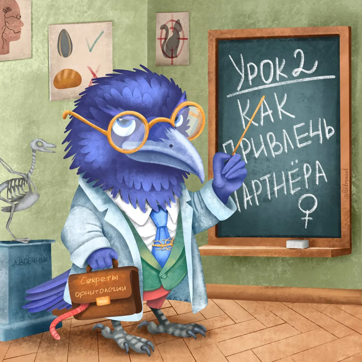 Карр! Не всё же думать о романтике — иногда нужно вовремя спрятаться, сбежать или притвориться кустом. О всех уловках – в следующем выпуске! С вами был профессор Орни – ваш наставник по пернатой эволюции!