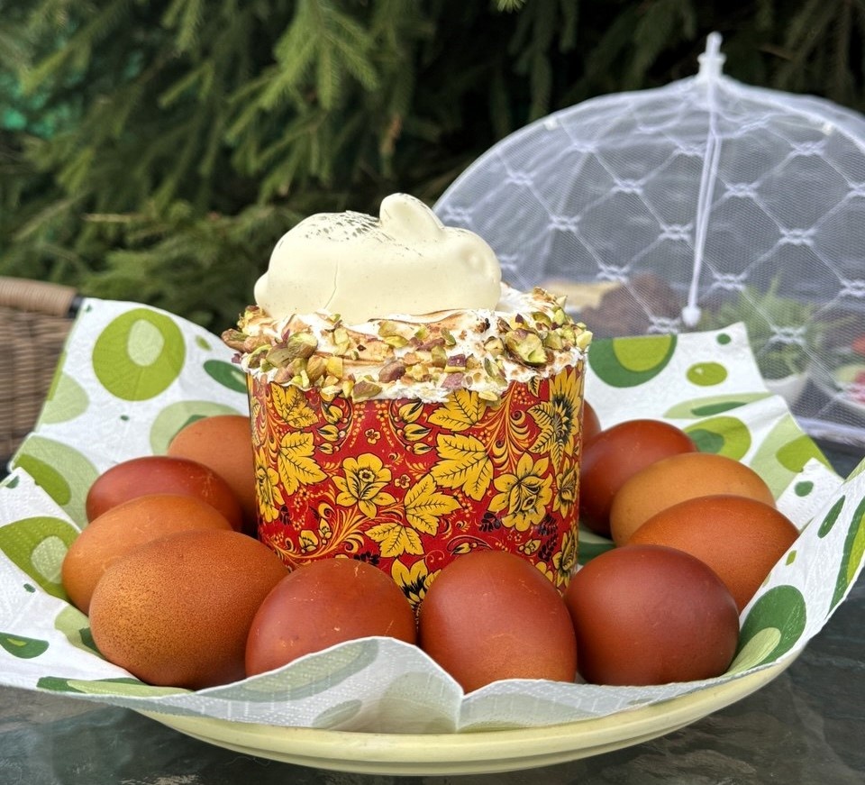 Так было и сегодня, когда мы проснулись, кулич был установлен на блюдо и обложен пасхальными яйцами.