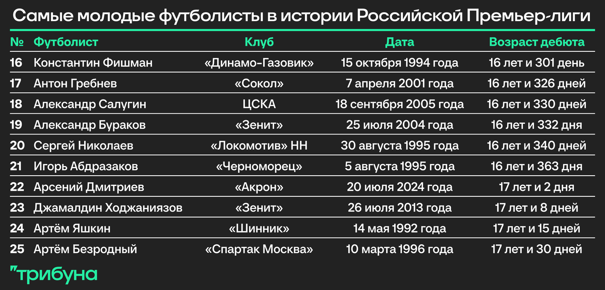 Выше представлены футболисты, расположившиеся с 16-й по 25-ю строчку в списке самых молодых дебютантов в истории РПЛ. Стоит отметить, что среди них есть игрок, впервые сыгравший в матче Премьер-лиги только в этом сезоне, – Арсений Дмитриев из «Акрона». Но раньше них в лиге дебютировали еще 15 человек, о которых пойдет речь ниже.