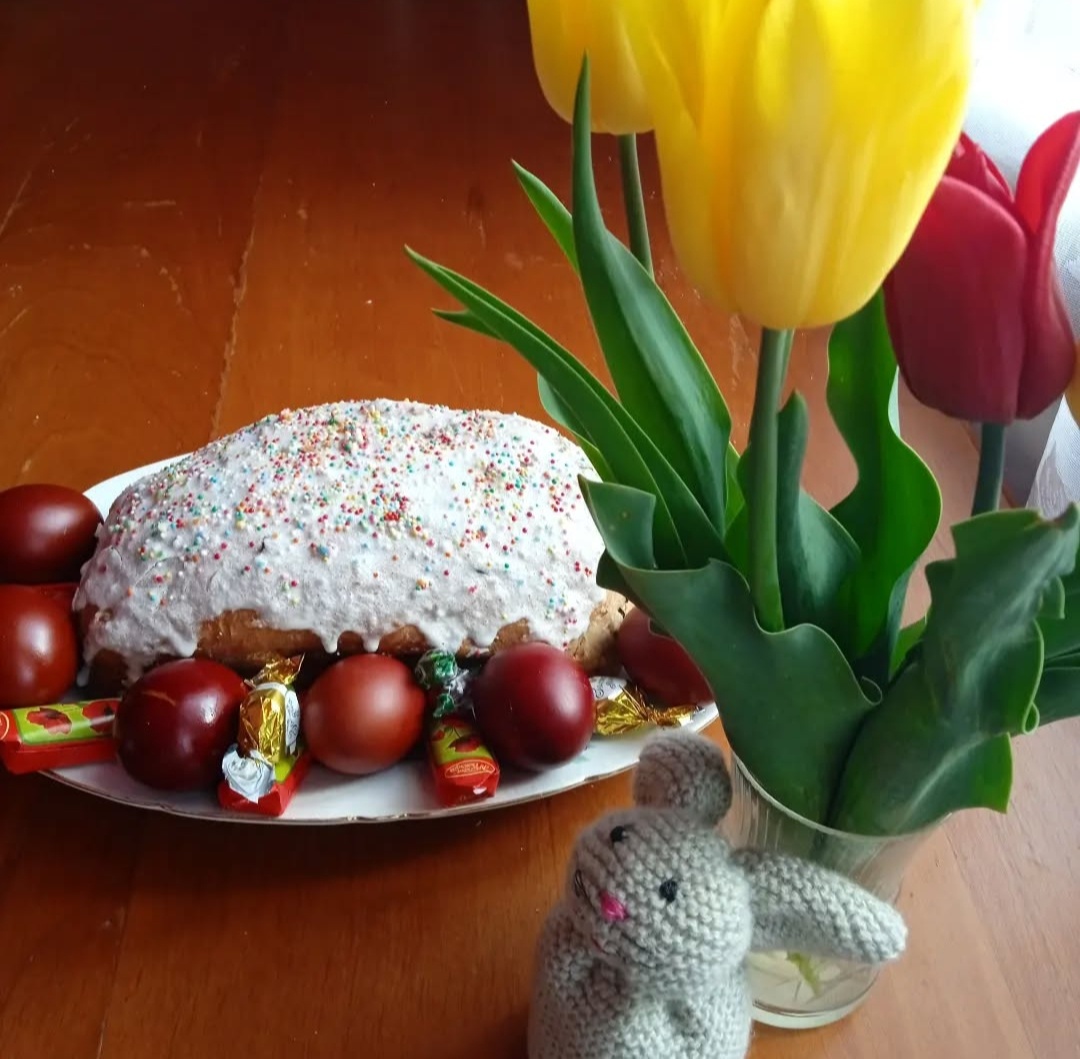 Собрала куличи, крашеныйе яйца, нарезала сирени и отправилась к маме. Я на Пасху всегда утром приношу ей освященные куличи.
