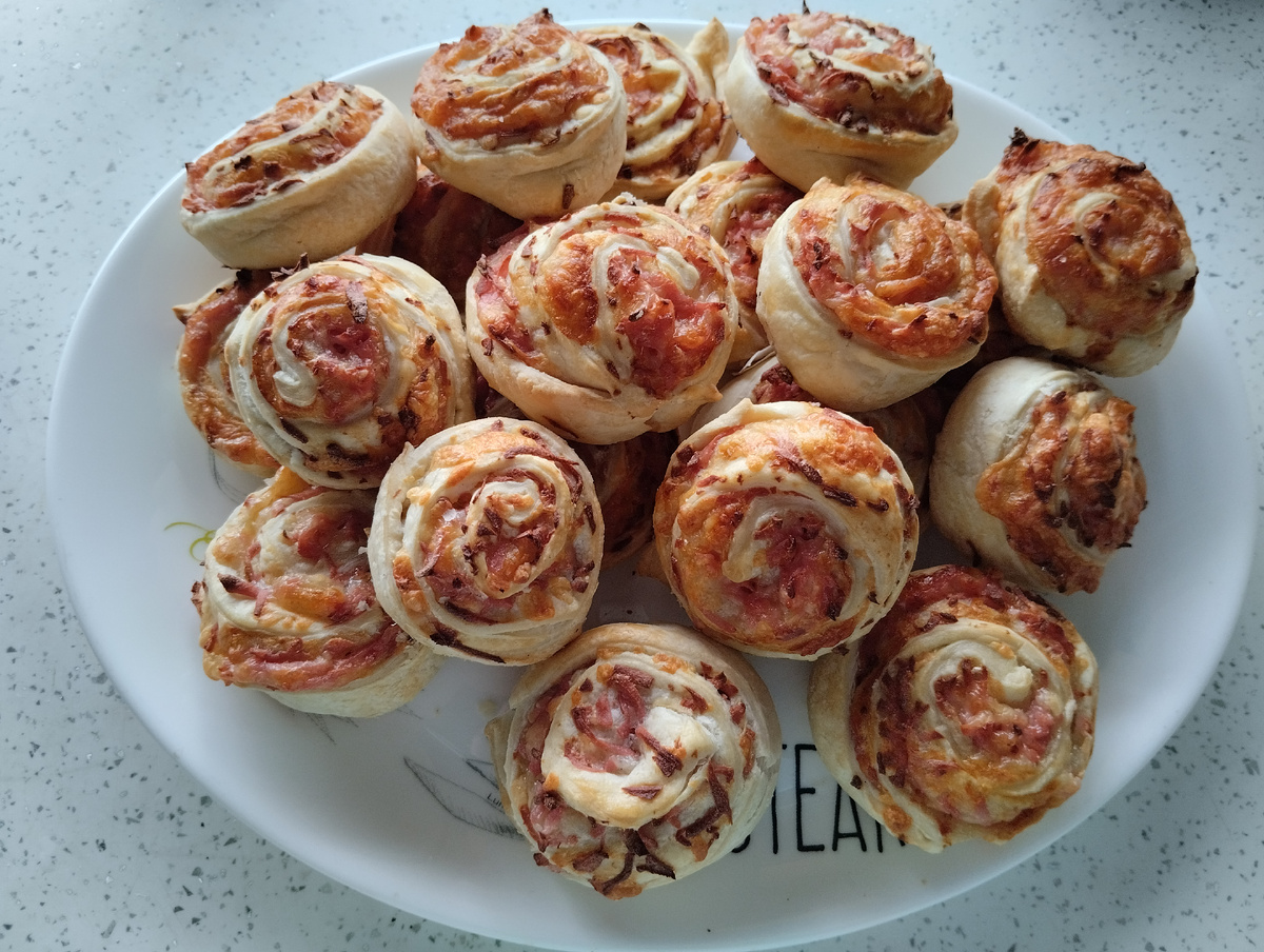 Этот рецепт очень прост в приготовлении и очень вкусный. Очень хорош для украшения праздничного стола. А самое главное быстро готовить и получится у каждого. И так же быстро улетает со стола. Сыр твердых сортов - 100-150 гр. Колбаса вареная или копченая -250-300 гр. Тесто слоёное бездрожжевое 0,5 кг. Колбасу натереть на крупной тёрке Сыр так же натереть на тёрке . Можно натереть в отдельные ёмкости, но я сделала всё в одну ёмкость. Раскатать тесто не очень тонко. На фото примерно показано соотношение раскатанного теста к не раскатанному. Разложить начинку равномерно. Слой начинки не толстый. Закрутить рулет, плотный. Край хорошо защипнуть. Можно край смочить водой, если не заклеивается . Нарезать рулет на части 3-5 см. Можно на противень подстелить пергамент или пакет для запекания . Укладывать на противень шайбочки, верх немного раскрыть. Верх сформировать в виде лепестков как бы расширить, отогнуть тесто. Вот такие цветочки получаются. Можно смазать молоком, яйцом или крепк