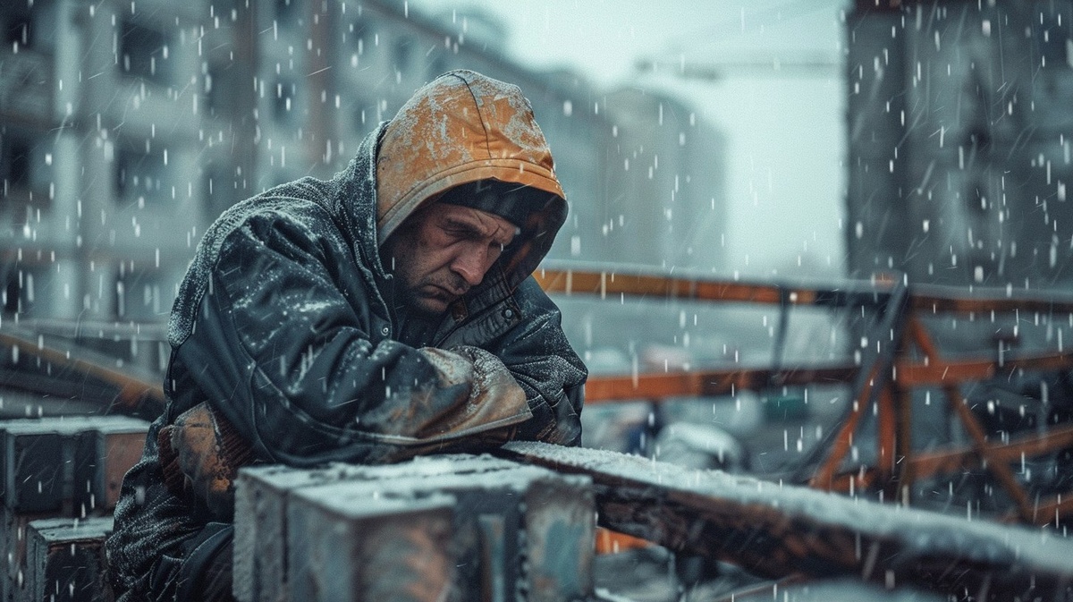 Создано на основе запроса: hyper-realistic photo of a brick layer on a busy building site in the pouring rain. He looks depressed