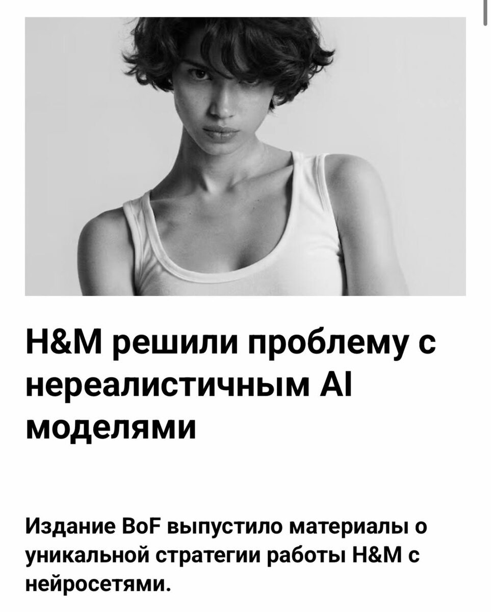 В ответ на пост H&M уже используют в своей рекламе нейро-клонов реальных моделей, эти модели получают за это реальные деньги💸 90% людей даже не заподозрят что это генерации, а компании экономят на целой съемочной команде ЗАМЕНЯЯ ВСЕХ одним арт-директором проекта, который модет сделать все в одиночку. И это происходит уже сейчас🤯 Подробнее в сегодняшнем подкасте☝🏻 Какие мысли по этому поводу?)