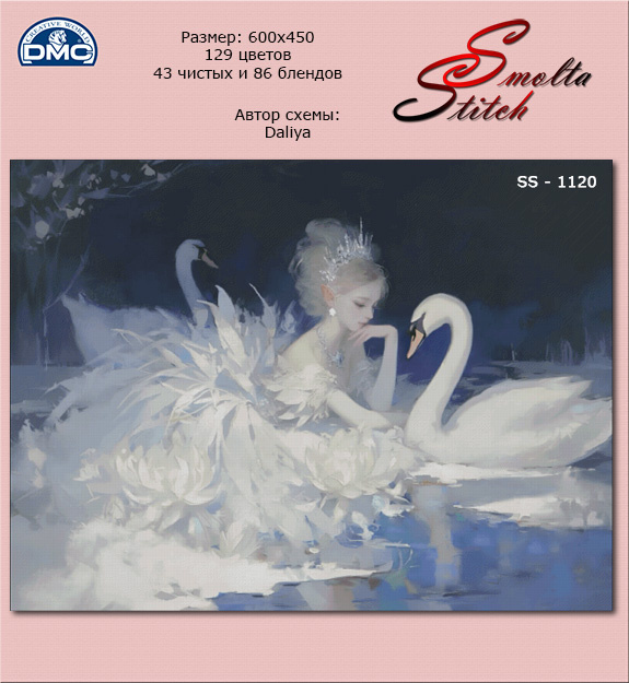 Нежный красивый сюжет "Лебединое озеро". Вышиваться будет достаточно легко. Все основные цвета идут крупными фрагментами. Наиболее сложные участки: лицо и украшения. Конечно, как и во всех многоцветках, есть малочисленные цвета. Но они сосредоточены в определенных местах, где требуются. Приобрести схему можно в группе ВК https://vk.com/smolta_hm На Boosty https://boosty.to/smolta-stitch/posts/0d61820b-7802-4460-90f9-651eb588a1a9?share=post_link