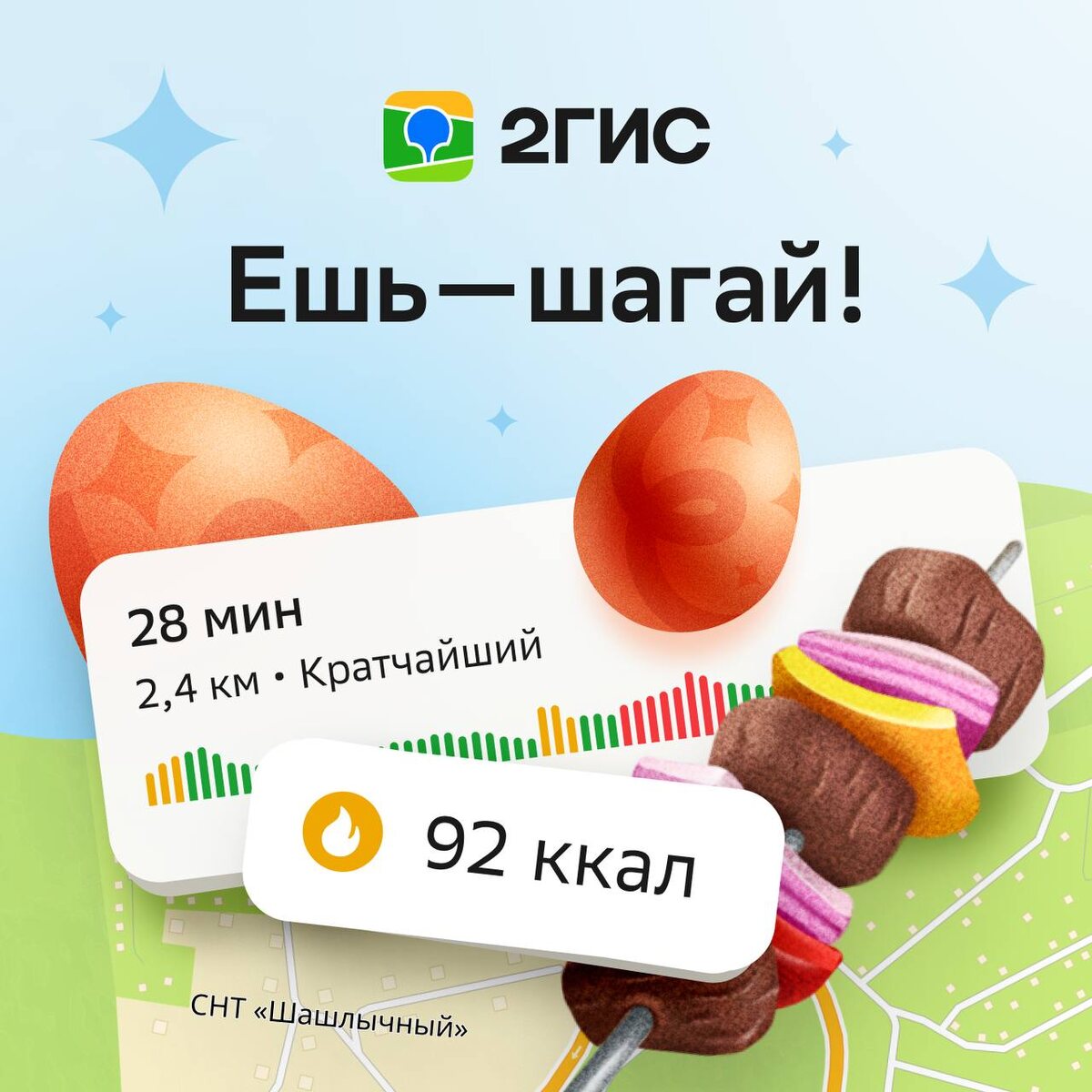 Кулич? Шашлык? Ещё один? Почему бы и нет. Главное — не забывать про баланс: съел — прогулялся. В пешем навигаторе 2ГИС видно, сколько калорий сгорает на каждом маршруте 🔥 Работает лучше, чем обещания начать с понедельника.