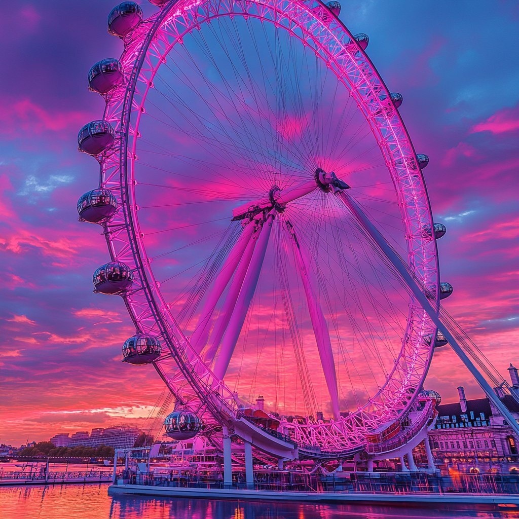 Создано на основе запроса: London eye at sunset, pink sunset reflection everything is reflecting and there are intricate old objects