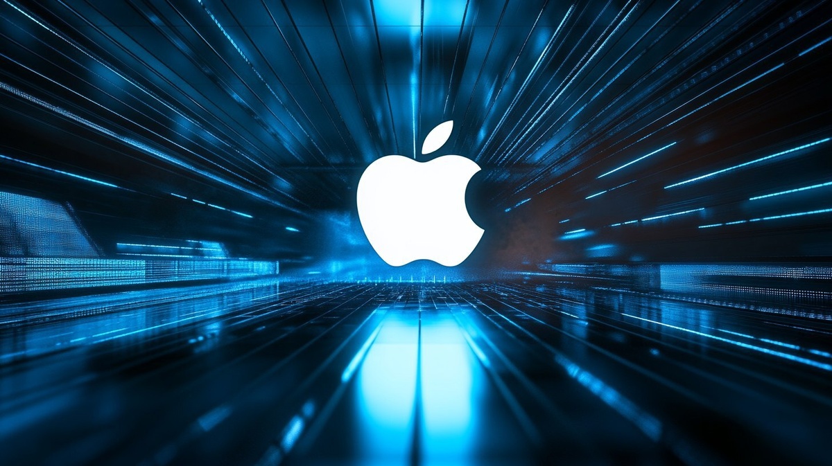 Создано на основе запроса: dynamic quick zoom-in to an iconic glowing Apple logo, surrounded by dramatic light flares, sleek futuristic