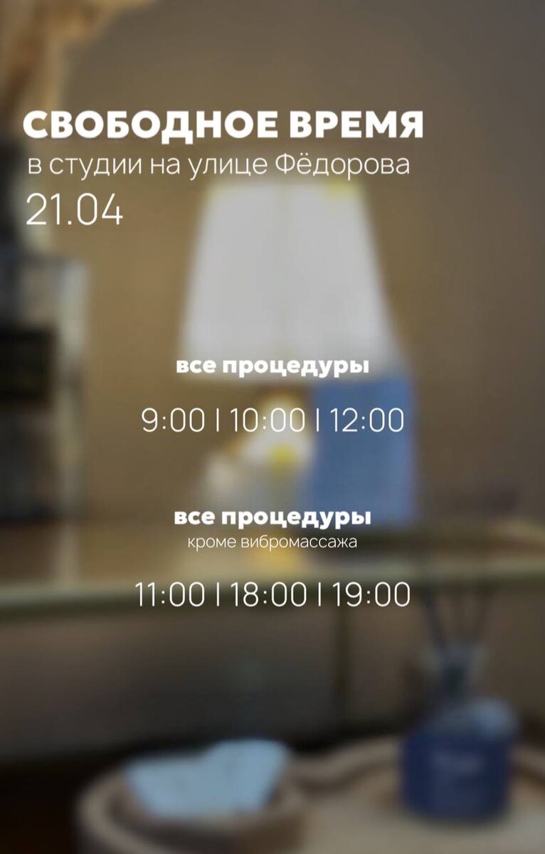 СВОБОДНОЕ ВРЕМЯ НА ФЁДОРОВА 21.04 • ONLINE запись • WHATSAPP Ждём вас к нам на процедуры 🤍