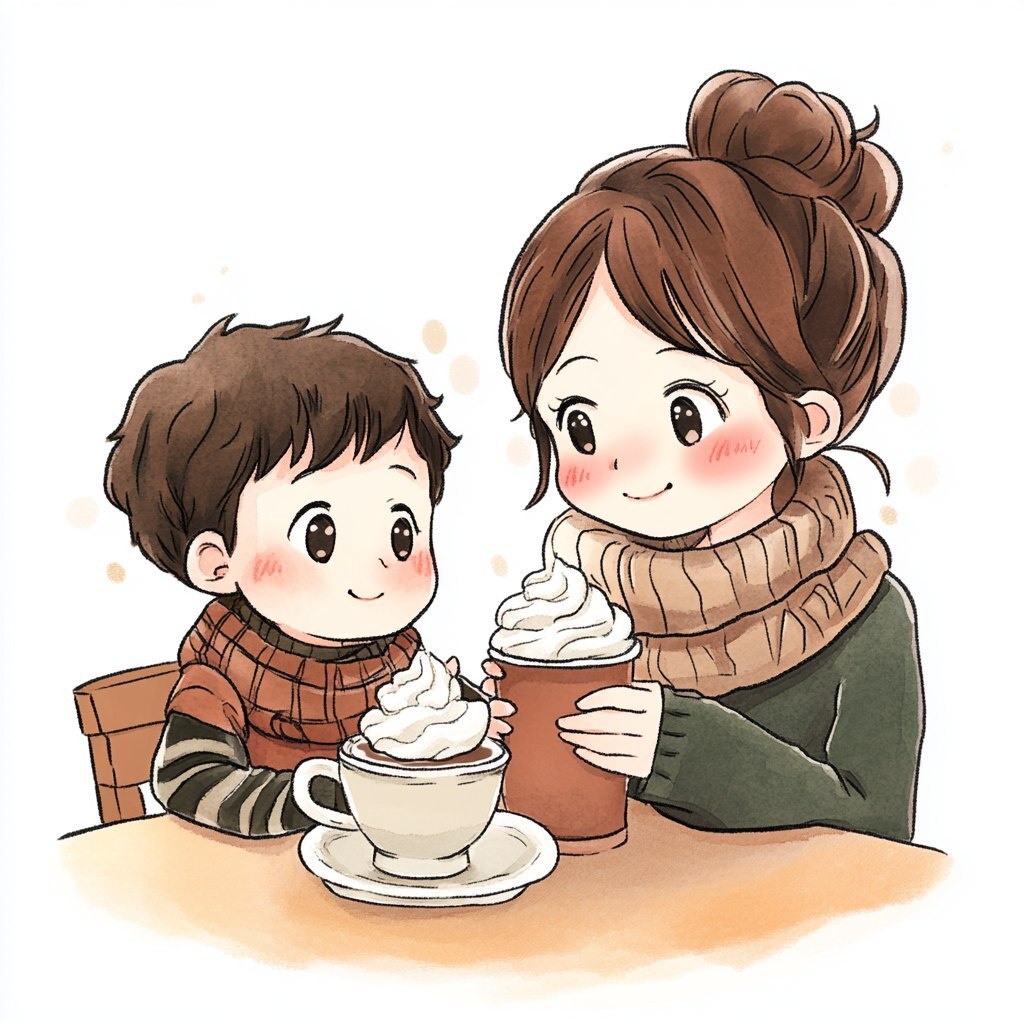 Создано на основе запроса: Chibi-style mother and son sitting at a café table, sipping hot cocoa with whipped cream and blushing cheeks