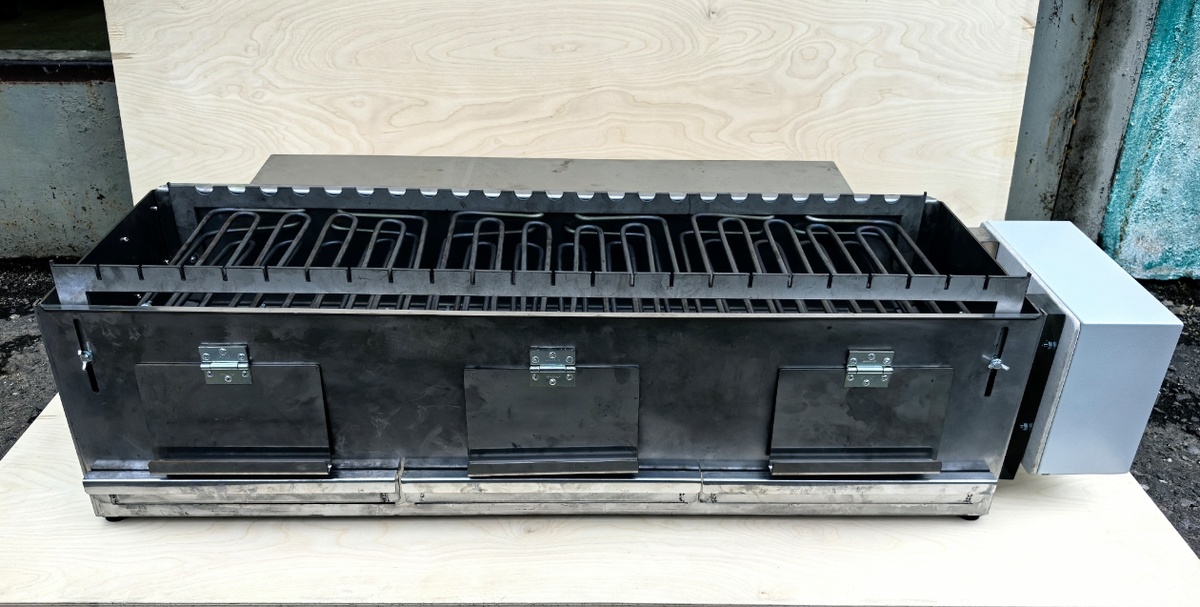 Электрический мангал МЭП-03 характеристики: Рабочая длина 1100 мм; Общая длина 1290 мм; Рабочая ширина 340 мм; Общая ширина 500 мм; Высота 300 мм; Количество пазов для шампуров 23 шт; Количество ТЭНов 6 шт; Количество секций 3 шт; Рабочее напряжение 220/380 В; Максимальная мощность 18 кВт; Минимальная мощность 6 кВт; Способ подключения: через автоматический выключатель; Цвет черный; Количество легкосъёмных герметичных поддонов 3 шт; Люк для чистки 3 шт; Время разогрева до рабочей температуры 4-5 минут. Мангал МЭП-03 подойдёт для торговой точки со большой проходимостью, кафе, ресторана или шашлычной. Три работающих независимо друг от друга секции и длина 1100 мм., этого мангала являются преимуществом в торговой точке с большим количеством клиентов . Мангал имеет три независимых друг от друга секции, что удобно при неполной загружености, это позволит экономить электроэнергию, так как можно включить одну или две секции, а при увеличении их числа например во время обеденного перерыва, ма
