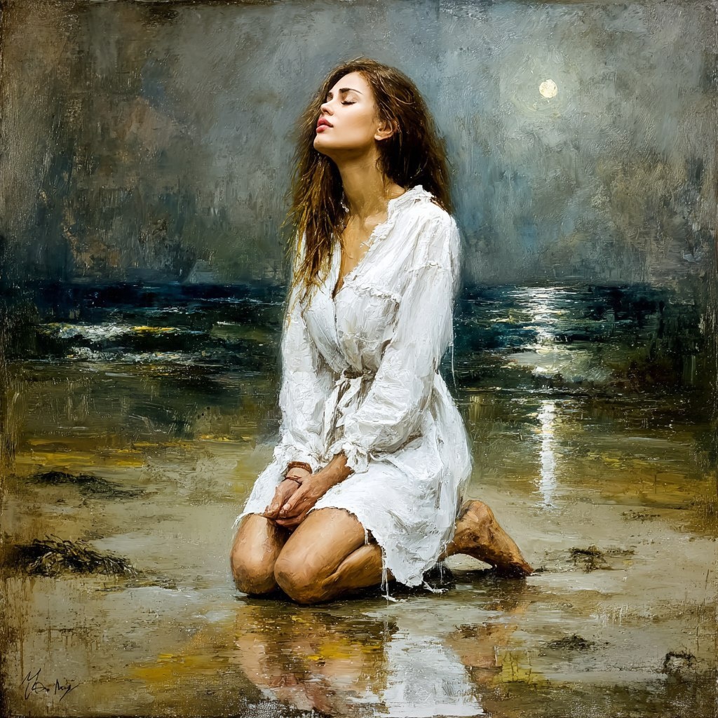 Создано на основе запроса: Portrait of an ethereal figure kneeling in prayer, bathed in the soft glow of the moon, close-up of their serene