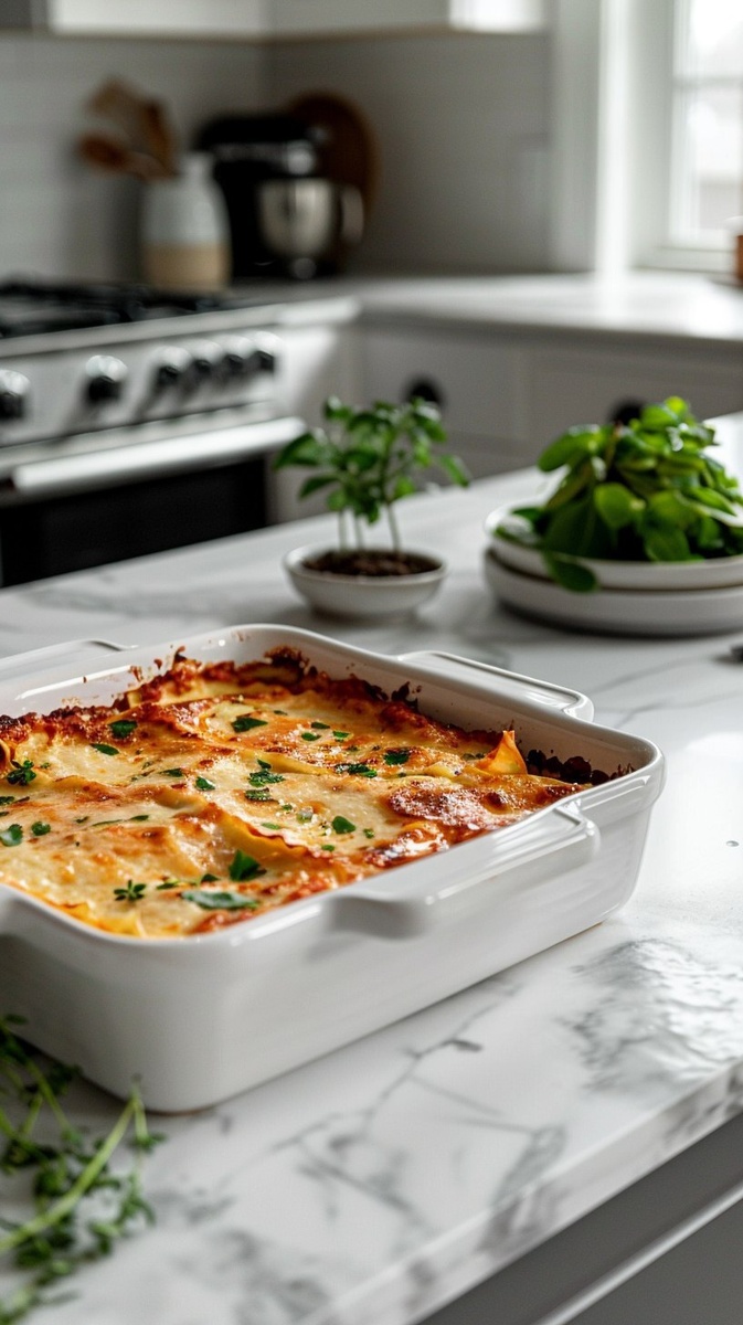 Создано на основе запроса: Eggplant Lasagna Layers of thinly sliced eggplant, seasoned ground pork, tomato basil sauce, mozzarella, and parmesan cheese, baked to perfection in a casserole dish, served hot with a side salad, set on a sleek white marble countertop in a bright, clean luxury kitchen with white cabinetry, modern appliances, and soft natural lighting high-quality food photography style --- Автоперевод: Слои лазаньи баклажанов тонко нарезанного баклажана, приправленную молочую свинину, томатный соус базиля, моцарелла и сыр пармезан, запеченные до совершенства в блюде кастрюли, подаются горячими с боковым салатом, расположенным на гладкой белой мраморной столешнице в яркой, чистой роскошной кухне с белыми шкафами, современными приборами и мягкими натуральными осветительными. Необычно выглядит? 🤔 https://dzen.ru/id/65c0c65c86e4f837c27b24d7 #ИИ #AI #нейросеть #midjourney #art