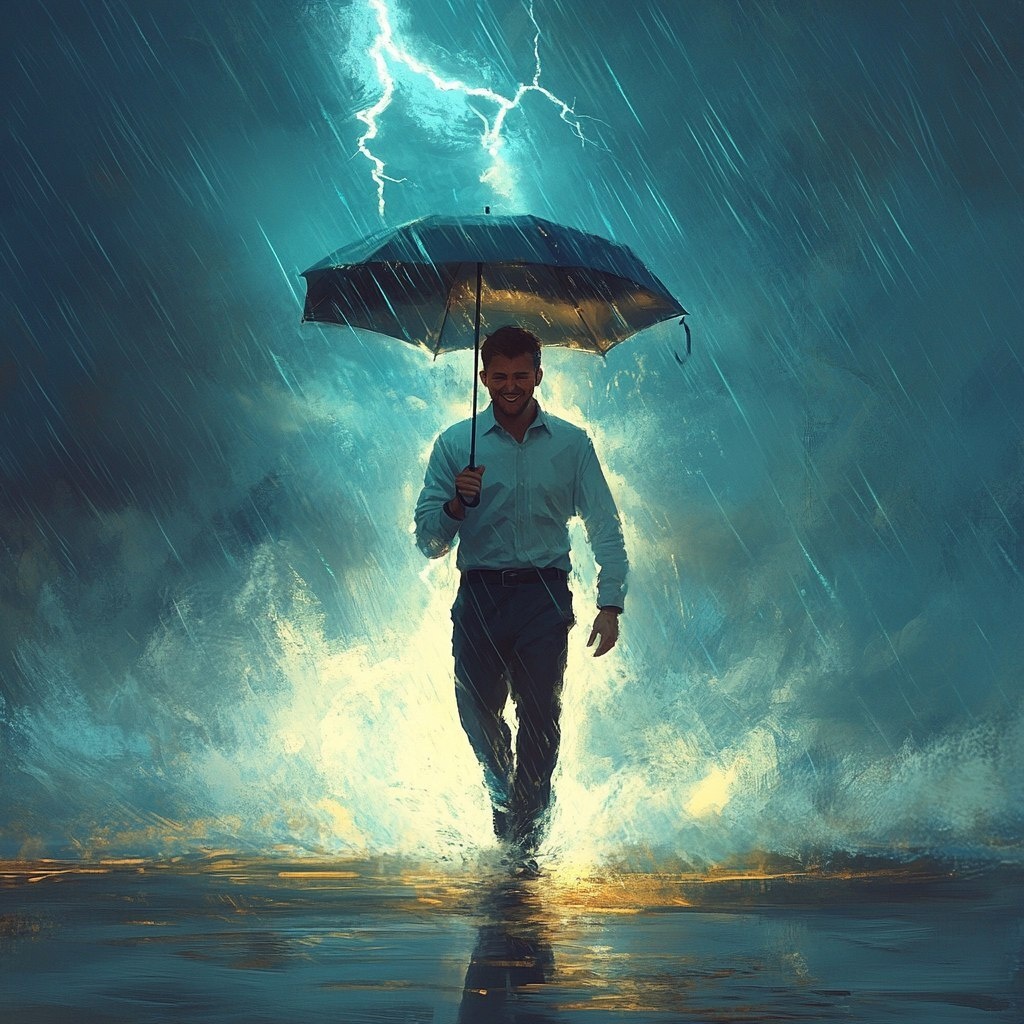 Создано на основе запроса: Strengthening mental resilience, a happy man walks with an umbrella during a storm, the umbrella is struck by lightning, the man smiles, he is psychologically appropriate, he does not fail at school --- Автоперевод: Укрепление умственной устойчивости, счастливый человек ходит с зонтиком во время шторма, зонт поражен молнией, человек улыбается, он психологически уместен, он не терпит неудачу в школе Как тебе это изображение? 🤔 https://dzen.ru/id/65c0c65c86e4f837c27b24d7 #ИИ #AI #нейросеть #midjourney #art
