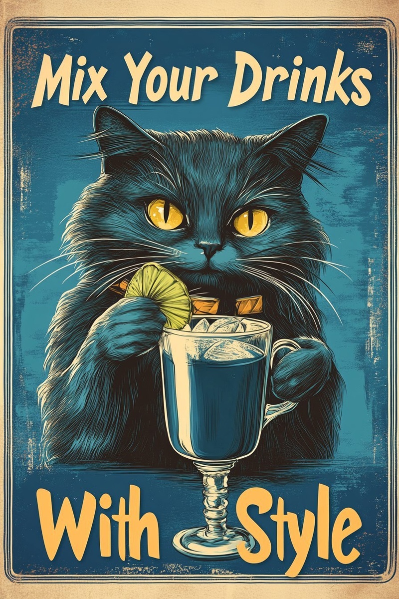 Создано на основе запроса: Afiș vintage cu o pisică neagră misterioasă ținând un pahar de cocktail, stil art deco, fundal albastru închis, text stilizat retro "Mix Your Drinks With Style", iluminare caldă, textură de hârtie veche --- Автоперевод: Afiș Vintage Cu O Pisică neagră misterioasă ținând un pahar de Cocktail, Stil Art Deco, Fundal albastru închis, текст Stilizat retro "Смешайте свои напитки с стилем", Iluminare Caldă, Textură de Hârtie Veche Классно вышло? 🤔 https://dzen.ru/id/65c0c65c86e4f837c27b24d7 #ИИ #AI #нейросеть #midjourney #art