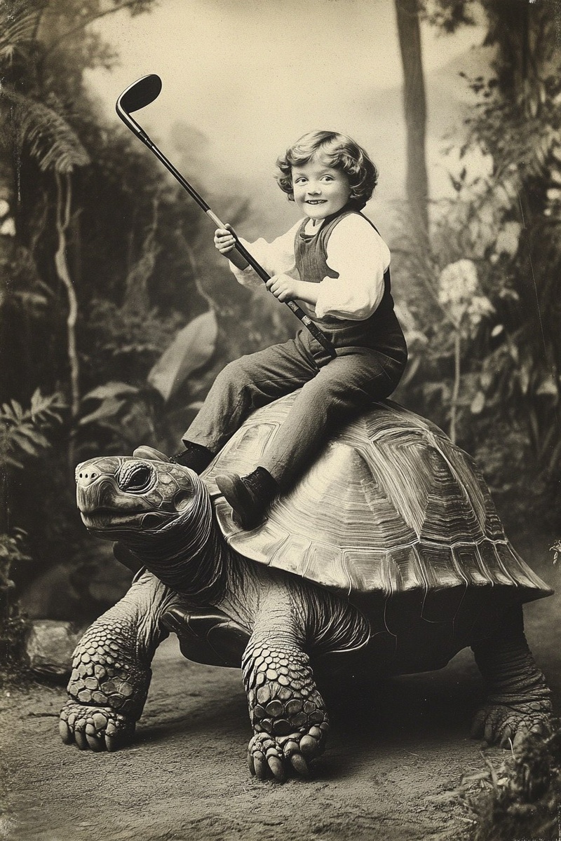 Создано на основе запроса: Boy riding a giant turtle while holding a golf club, black and white photo style, absurd vintage humor, antique