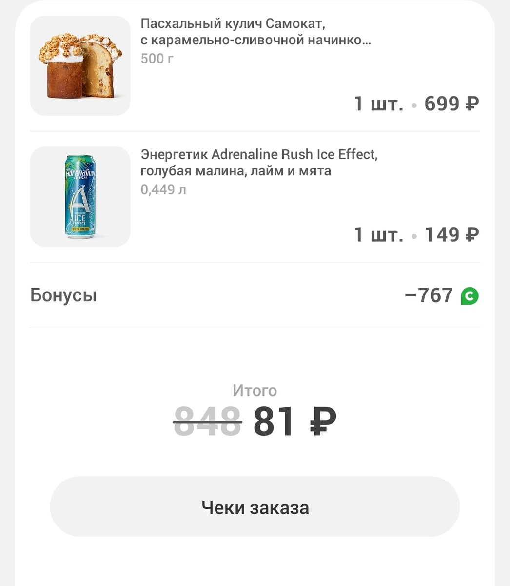 На Пасху очень хотела попробовать кулич из самоката, но расставаться с 700 р очень не хотелось. Поэтому я накопила бонусы спасибо в Сбере, а потом потратила их в самокате. Обычно любой кешбэк я откладываю на накопительный счёт, но в этот раз захотелось себя порадовать. Взяла ещё новый вкус энергетика на пробу, ну и чтобы добить нужную сумму для доставки. Списала все бонусы и получилась очень приятная цена: Сам кулич вкусный, попкорн, хоть и размокший тоже, а вот посыпка сверху ну слишком сладкая, практически вся осыпалась сразу при разрезе. Но я все равно довольна, что купила его, иногда нужно себя радовать) Сегодня кстати (20.04) скидки до 70% на куличи в перекрестке: В пятерочке был замечен милейший пасхальный набор для декора яиц. Я такие ну очень люблю! По акции вышел в 79 р, после Пасхи думаю они будут ещё дешевле, будем следить за ситуацией 🧐 Вот такие классные получаются "цыплята". Очень советую этот набор: Дикси. После Пасхи я отправилась на поиски похожих наборов на следующий