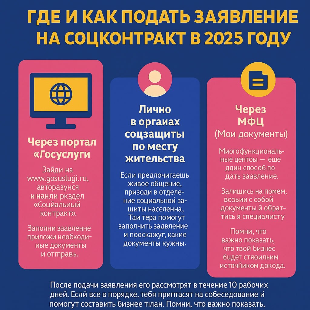 Где и как подать заявление на соцконтракт в 2025 году Хочу открыть своё дело, но не знаю, с чего начать... - знакомо? Давай разберёмся вместе. В 2025 году подать заявление на соцконтракт можно тремя способам👉 1️⃣Через портал «Госуслуги» Зайди на www.gosuslugi.ru, авторизуйся и найди раздел «Социальный контракт». Заполни заявление, приложи необходимые документы и отправь. Удобно, быстро и без очередей. 2️⃣Лично в органах соцзащиты по месту жительства Если предпочитаешь живое общение, приходи в отделение социальной защиты населения. Там тебе помогут заполнить заявление и подскажут, какие документы нужны. 3️⃣Через МФЦ (Мои документы) Многофункциональные центры — ещё один способ подать заявление. Запишись на приём, возьми с собой документы и обратись к специалисту. После подачи заявления его рассмотрят в течение 10 рабочих дней Если всё в порядке, тебя пригласят на собеседование и помогут составить бизнес-план. Помни, что важно показать, что твой бизнес будет стабильным источником