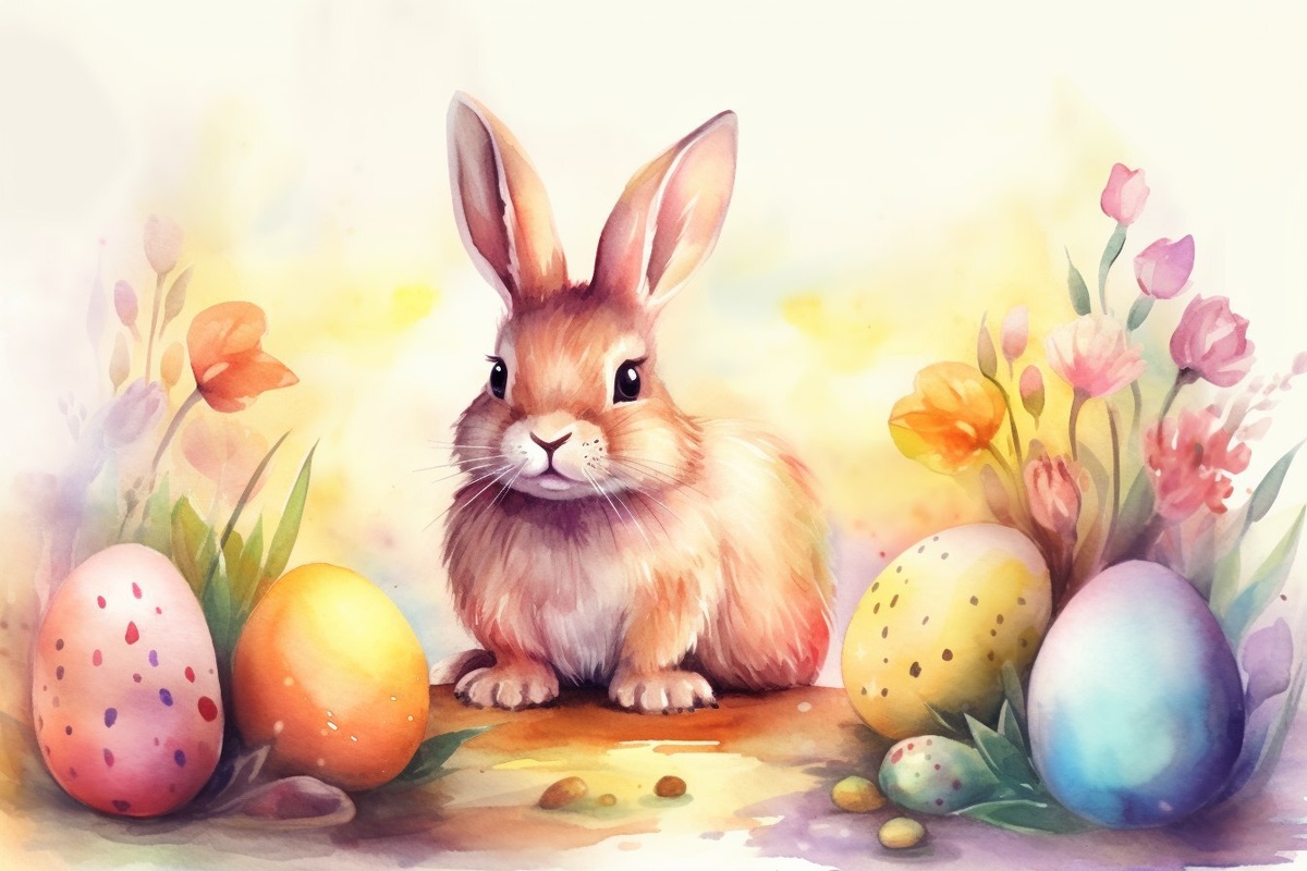 Создано на основе запроса: Easter greeting card with a cute bunny, colorful Easter eggs, spring flowers, a bright sunny background, soft