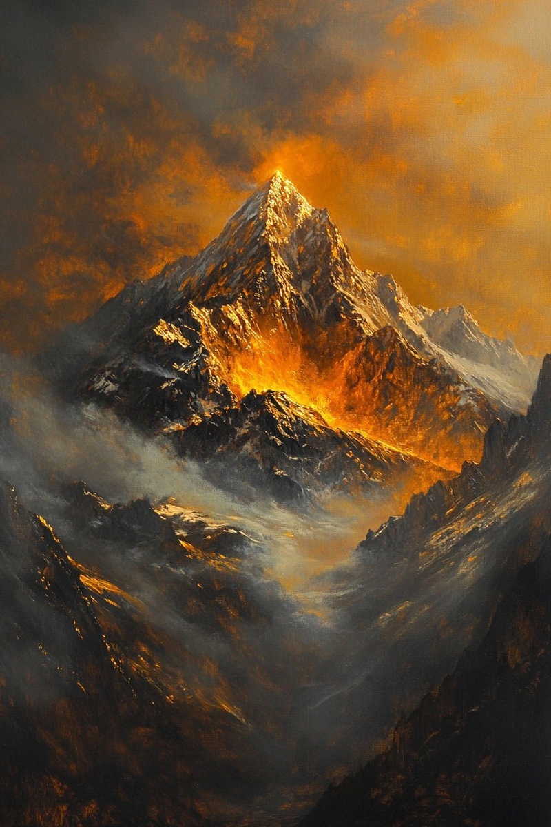 Создано на основе запроса: Peisaj montan dramatic, munți aurii scăldați în lumină aurie, cer baroc încărcat de nori pictați dinamic, detalii