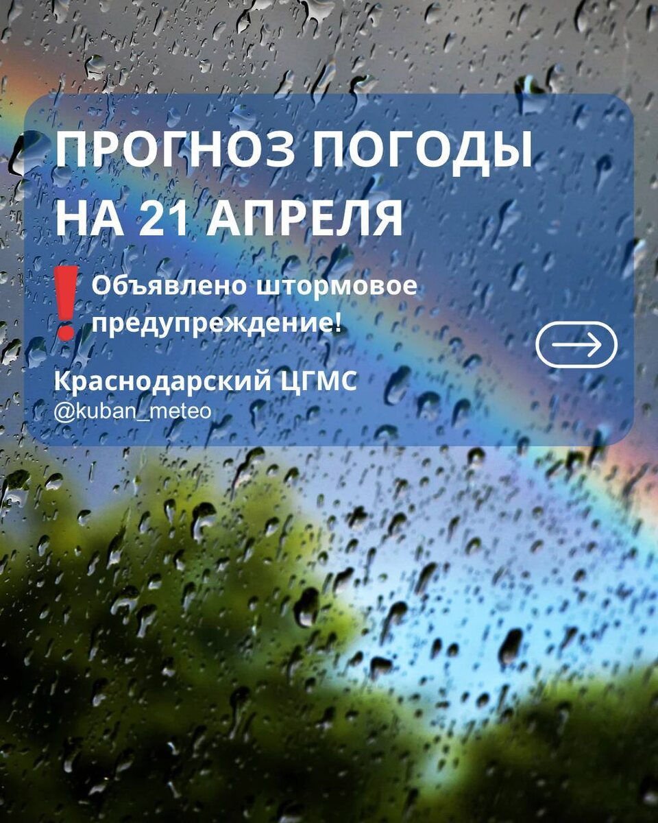 Начало недели в Краснодарском крае будет сопровождаться дождями, грозами и усилением ветра. В отдельных районах возможны ливни и град — действует штормовое предупреждение. Специалисты Краснодарского ЦГМС подготовили прогноз погоды на 21 апреля👇🏼 Температура воздуха на Черноморском побережье ночью +7…+12°, днём +12…+17°. 📌 Прогноз составлен с 18:00 20 апреля по всемирному скоординированному времени (UTC). 🟥 До конца суток 20 апреля и в течение 21 апреля местами в крае действует штормовое предупреждение: ожидается комплекс метеорологических явлений — сильный дождь, ливень, гроза, град и порывы ветра 20–22 м/с. Прогноз от @kuban_meteo