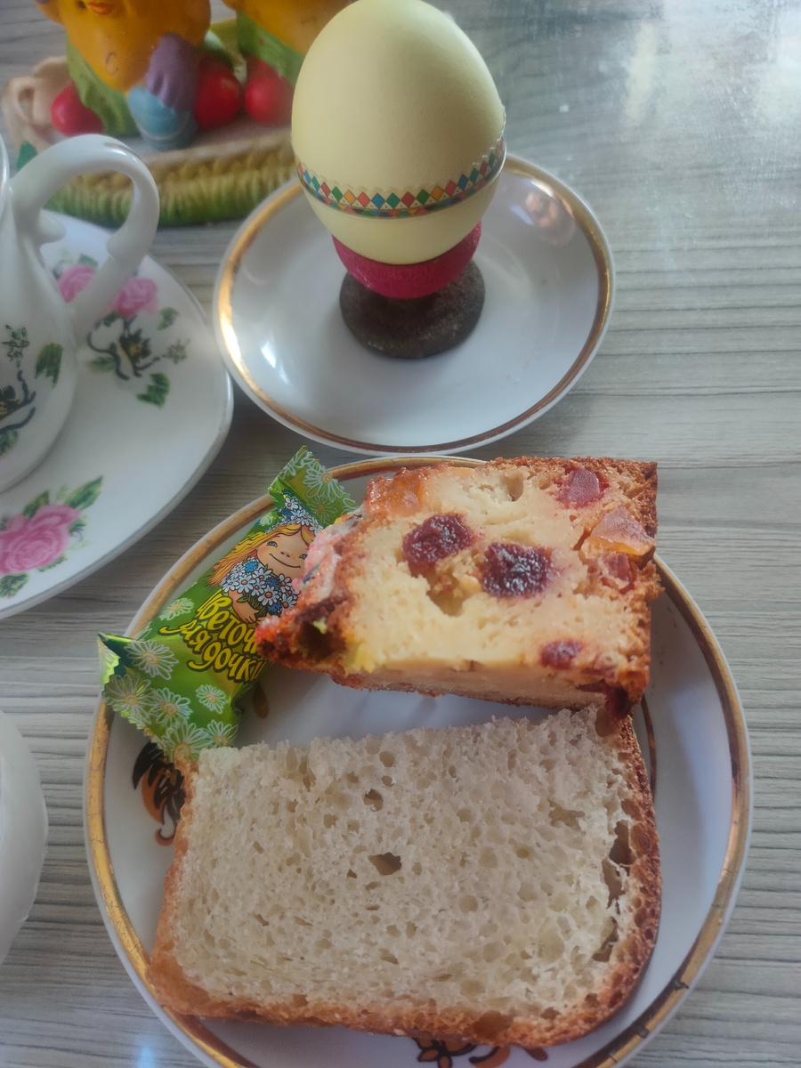 Доброго дня всем вам, милые дамы , верные спутники моего канала, а также те, кто из интереса заглядывает на его страницы! Меня зовут Надежда, и я приглашаю Вас на мою кухню, где покажу Вам наше меню на день. Сегодня самый светлый день в году - это Пасха. Уже с самого раннего утра у нас тепло, муж проснулся около 5 утра, на термометре было уже +14 градусов. Я же встала в 8 утра, в окно светило яркое солнышко. Сразу же на душе так светло. Все знакомые и родные поздравляют с этим днем. Конечно же, на завтрак были крашеные яйца, больше ничего готовить не стала, ели еще сметану с сахаром и кусочком хлеба, свой хлеб мы умяли за два дня, а покупной ест в основном только муж, ему его хватает на 4 - 5 дней. Я себе сварила, как всегда, черный натуральный кофе, муж пил чай, кофе пили с куличом, который у меня не получился, так как много положила муки, тесто получилось тяжелое, как говорится, первый блин комом, и с конфетой "Цветочки для дочки", ничего особенного в этих конфетах нет, но есть мо
