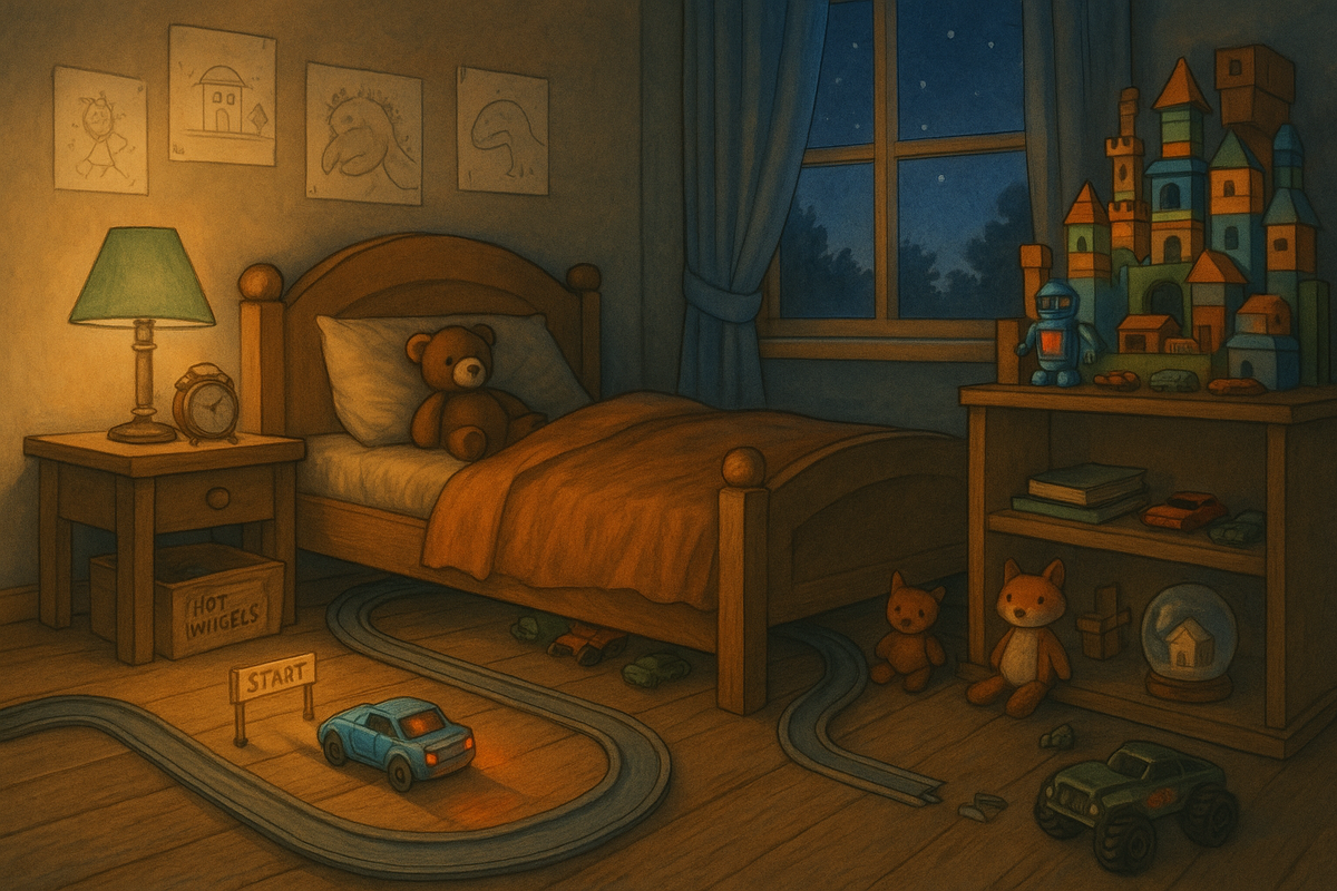 Когда последний луч солнца скрылся за горизонтом, детская комната наполнилась едва слышным шепотом. Игрушки, затаив дыхание, ждали сигнала. Его подал старый будильник с отколотой стрелкой — он прозвенел трижды, словно колокол на старте.