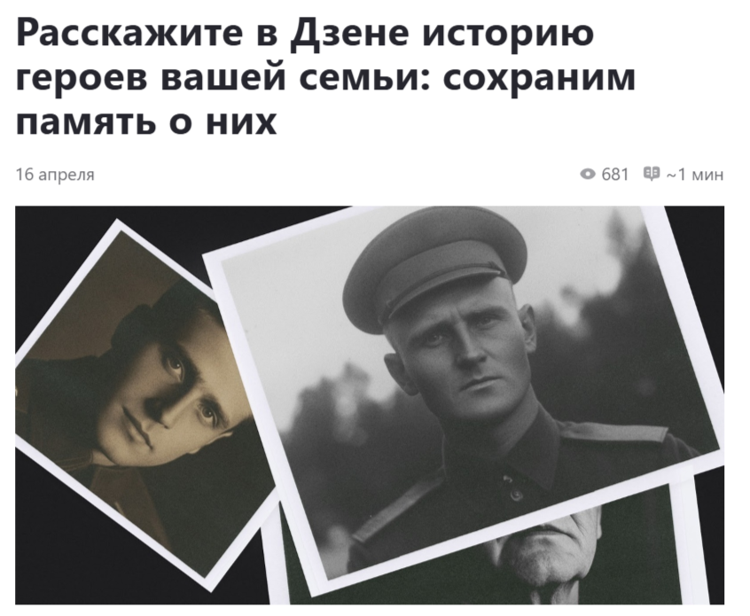 Дзен призвал принять участие в "Архивах памяти 1941-1945". Читайте здесь первоисточник. Привожу фото статьи. Дальнейшую судьбу публикаций сообщу, как только Дзен отреагирует. Желающие прислать истории своей семьи о войне, пожалуйста. Опубликую на канале вне очереди, отправлю в проект Дзена. Большей информацией, чем поведал Дзен в своей статье не обладаю. Ваш BV.