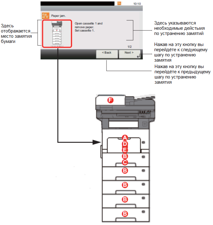 Если указан компонент, который может быть виновником, со схемы выше, то в скобках будет указан его номер. - Место замятия: На картинках выше буквами и цифрами отмечены локации аппарата. Эти буквы буду писать тут. Если ничего не указано, значит ошибка не привязана к какому-то определённому месту.