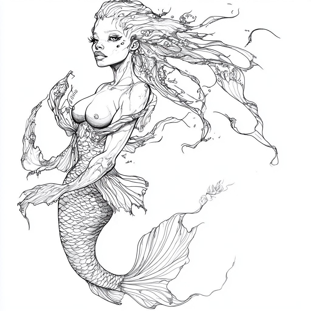 Создано на основе запроса: a line drawing of an evil mermaid, african american female features