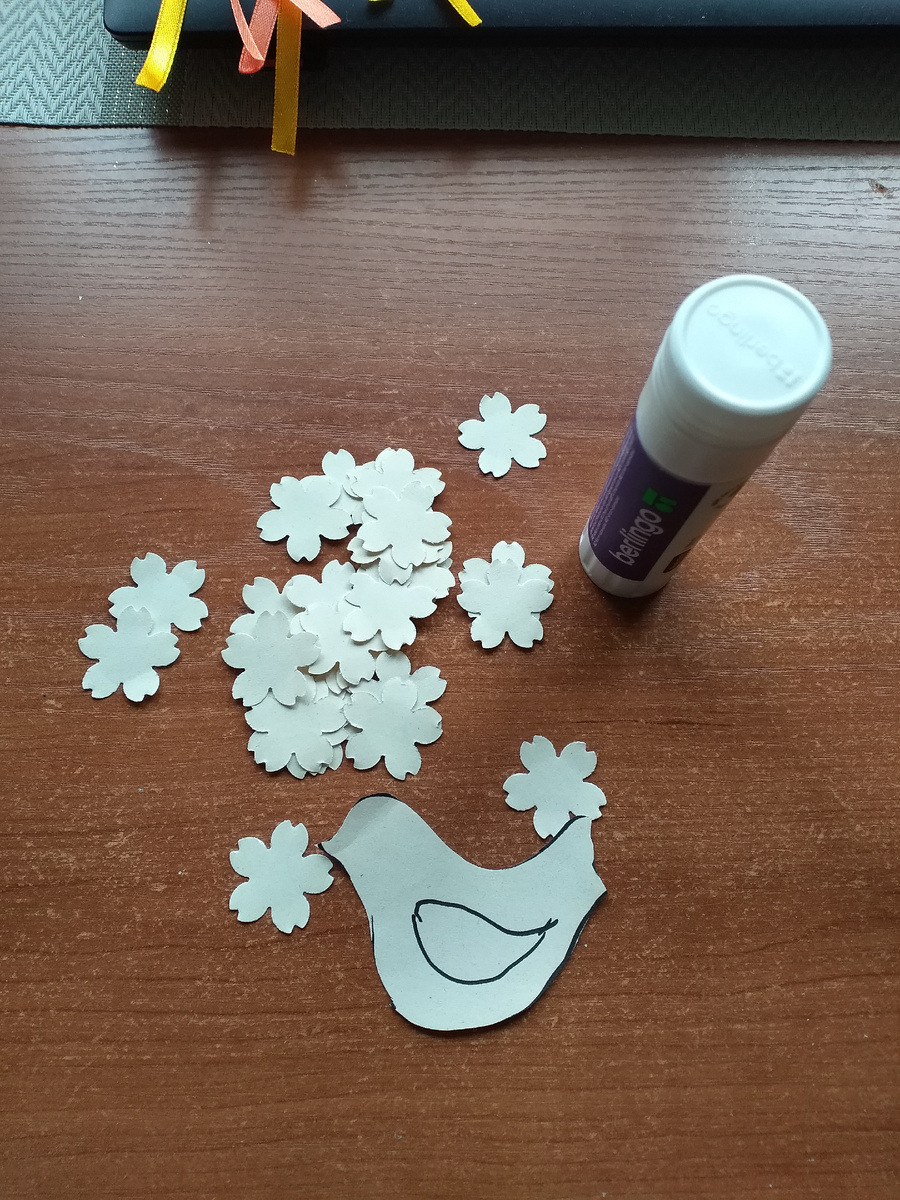 Как я уже не раз говорила, мои фигурные дыроколы хорошо вырубают фоамиран только с бумагой. Поэтому у меня остаётся много бумажных заготовок цветочков. И вот, когда я решила делать открытку своими руками для настенного панно, решила сделать из этих цветочков птицу. Нарисовала заготовку птицы, вырезала и начала клеить цветочки на карандашный клей. Сангина это такой мелок, как сухая пастель терракотового цвета. Сангину для рисования использовали ещё в средние века. Цвет варьируется от светлого до тёмного и зависит от степени прожарки и просушки жжёной окиси железа. Наиболее известные работы сангиной Анатомические рисунки Леонардо Да Винчи были выполнены сангиной. Они получаются живыми, засчёт возможности детальной прорисовки. Но сангина отсыпается, поэтому картину выполненную сангиной надо поместить под стекло. Я, например забрызгивала лаком "Прелесть". Пробовала мелком прямо по бумаге, получилось не очень, попробовала при помощи влажной салфетки - результат удовлетворил. Взяла с