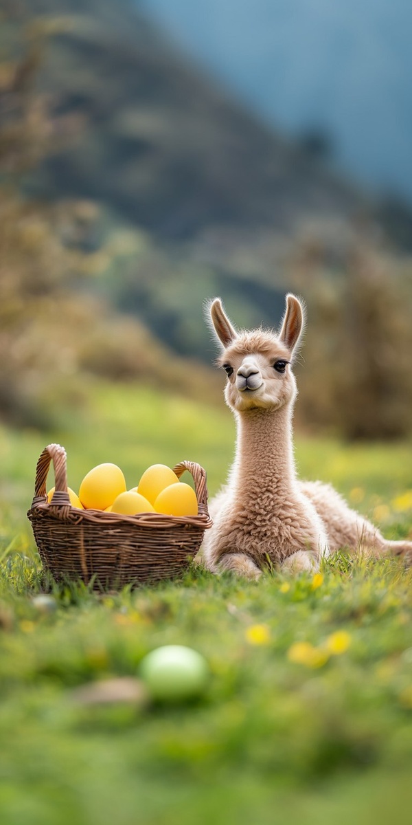 Создано на основе запроса: a surreal photography shot with a Canon EOS R5 + 70-200mm f/2.8 lens, of a happy Baby Llama relaxing near a basket full of easter eggs painted in yellow and green solid colors (the shades of yellow and green are the ones from the Brazilian flag) . She is standing in a representative place in Peru. There is enough negative space in the photo left to add an Easter message. --- Автоперевод: Сюрреалистическая фотография, снятая с линзой Canon EOS R5 + 70-200 мм f/2.8, счастливой маленькой ламы, расслабляющейся возле корзины, полной пасхальных яиц, окрашенных в желтые и зеленые цветы (оттенки желтых и зеленых-это те, что из бразильского флага). Неплохо выглядит? 🤔 https://dzen.ru/id/65c0c65c86e4f837c27b24d7 #ИИ #AI #нейросеть #midjourney #art