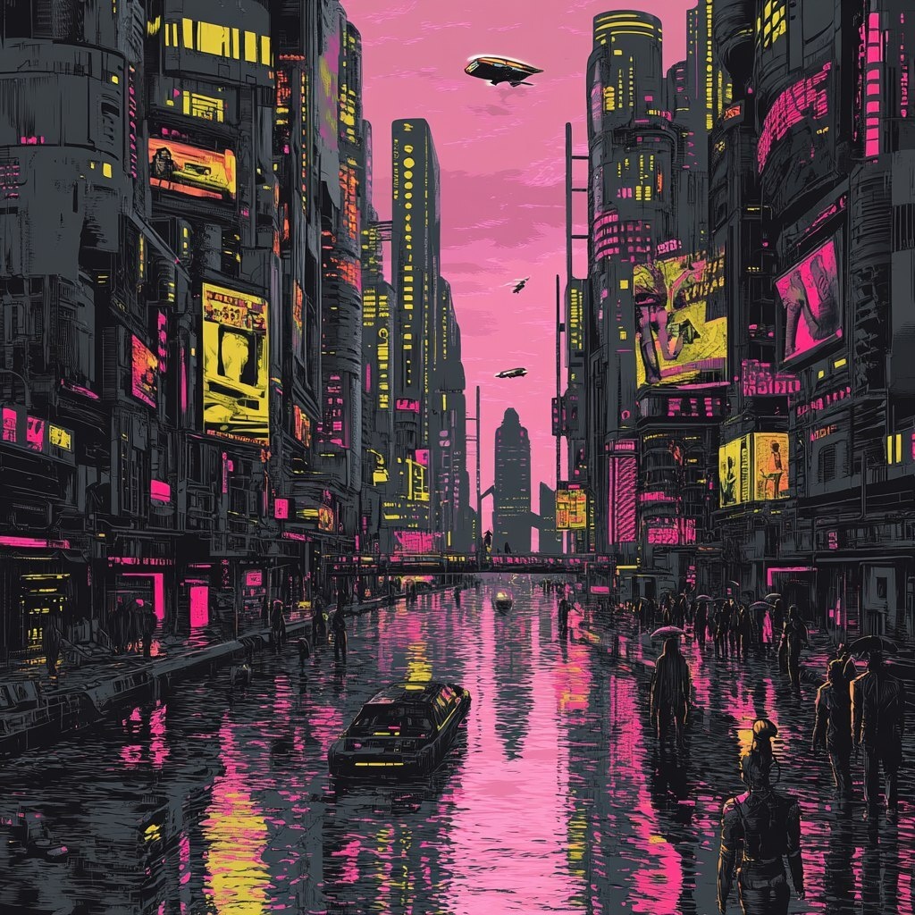 Создано на основе запроса: A futuristic cityscape at dusk, with neon lights and holographic billboards reflecting in the rain-soaked streets. The sky is painted pink by the setting sun, while sleek flying vehicles glide between towering skyscrapers adorned with cyberpunk art. People walk along vibrant canals, their attire blending seamlessly into the urban environment. This scene captures an immersive blend of technology and nature, showcasing a world where advanced architecture meets organic design. --- Автоперевод: Футуристический городской пейзаж в сумерках, с неоновыми огнями и голографическими рекламными щитами, отражающими на пропитанных дождем улицах. Неплохо получилось? 🤔 https://dzen.ru/id/65c0c65c86e4f837c27b24d7 #ИИ #AI #нейросеть #midjourney #art