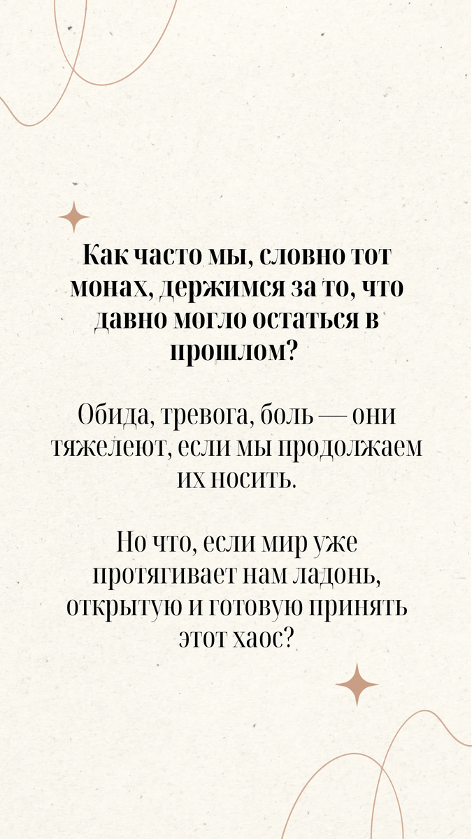 Как часто мы, словно тот монах, держимся за то, что давно могло остаться в прошлом? Обида, тревога, боль — они тяжелеют, если мы продолжаем их носить.