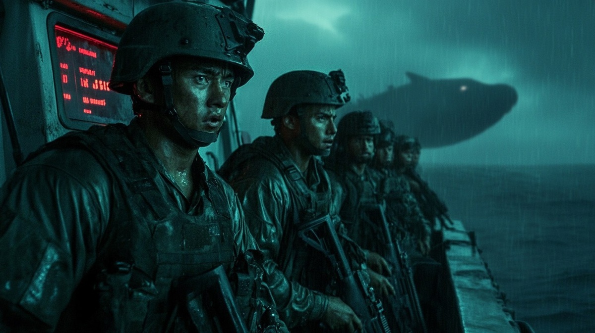 Создано на основе запроса: A group of Peruvian marines in modern naval uniforms, standing on the deck of a dark, weathered floating base in the middle of the South Pacific at night. Their faces are tense and terrified as they stare into the black ocean. Behind them, the radar screens glow red with static, alarms flickering. Beneath the surface, an enormous, shadowy shape moves silently --- Автоперевод: Группа перуанских морских пехотинцев в современной военно -морской форме, стоящая на палубе темного, выветрившегося плавучего основания в середине южной части Тихого океана ночью. Как тебе этот вариант? 🤔 https://dzen.ru/id/65c0c65c86e4f837c27b24d7 #ИИ #AI #нейросеть #midjourney #art
