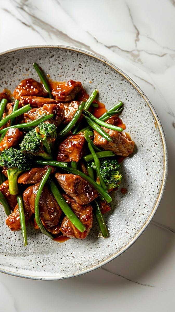 Создано на основе запроса: top view Stir-fried beef strips with tender broccoli and green beans in a savory glaze, set on a sleek white
