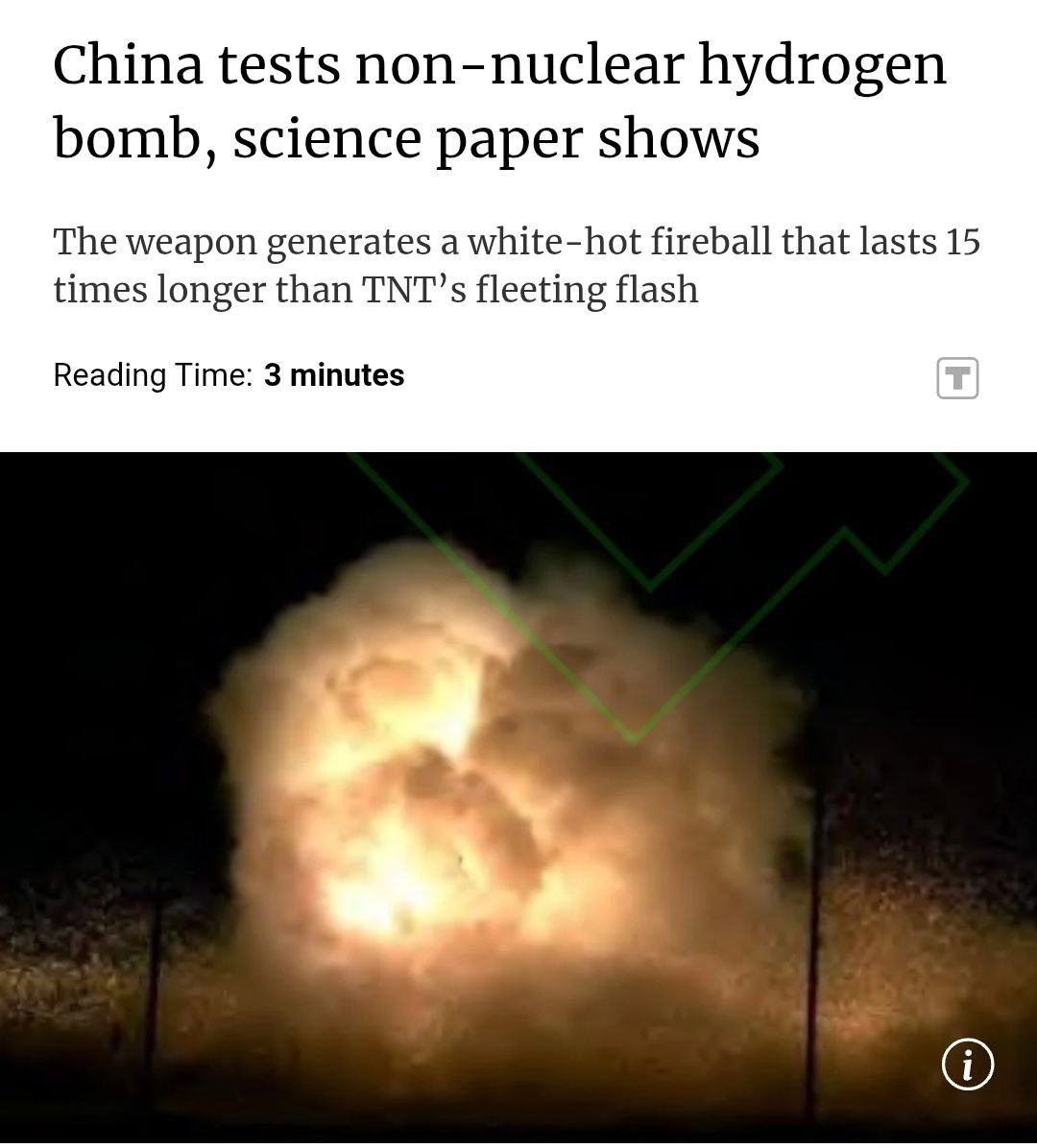 Breakthrough test of NON-nuclear hydrogen bomb in China