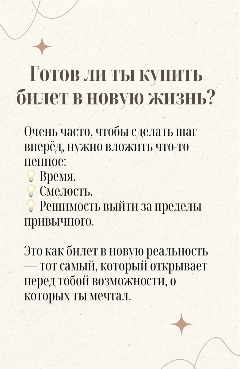 Часто, чтобы открыть дверь к новым возможностям, сначала нужно сделать шаг. И этот шаг иногда требует входного билета: 🎟 Оплатить обучение или консультацию со специалистом. 🎟 Записаться на нетворкинг в месте, которое пока кажется тебе «не твоего уровня». 🎟 Переехать в другую страну, даже если страшно. А какие у тебя были такие «билеты»? Что для тебя стало точкой перехода на новый уровень? 💡 Готовность инвестировать в своё развитие — это не просто трата. Это проверка намерения, твоего «да» переменам, твоей решимости двигаться вперёд. Конечно, здесь важно внутреннее чутьё — чувствовать, что это действительно твой путь. Но раз за разом я вижу: одно новое действие может привести к квантовому скачку. Когда моя интуиция пульсирует от предвкушения, я не думаю о цене, я думаю о ценности. 📌 Спроси себя: — Куда ты идёшь? — Каким ты хочешь быть через год, три, пять? — Делаешь ли ты что-то для этого каждый день? — А что ты теряешь, когда тратишь время на тревоги и страх? Закрой глаза. Предста