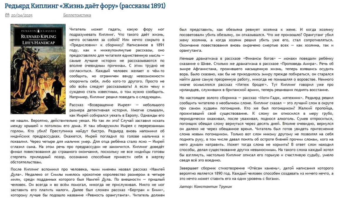 Редьярд Киплинг «Жизнь даёт фору» (рассказы 1891) Критика