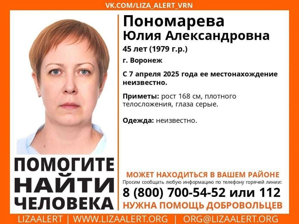 В Воронеже пропала без вести 45-летняя Юлия Пономарева. Местонахождение женщины неизвестно с 7 апреля. Об этом сообщили волонтёры поискового отряда "ЛизаАлерта" Воронежской области. Рост Юлии составляет 168 сантиметров. У неё серые глаза и плотное телосложение. В чем была одета женщина – неизвестно. Если вам известно, где может находится Юлия Пономарева, просьба сообщить об этом в службу 112 или позвонить по номеру телефона горячей линии отряда 88007005452. Вчера стало известно об исчезновении еще одной женщины. 63-летняя Татьяна Перцева пропала в селе Староживотинное Рамонского района. Местонахождение женщины неизвестно с субботы, 18 апреля.