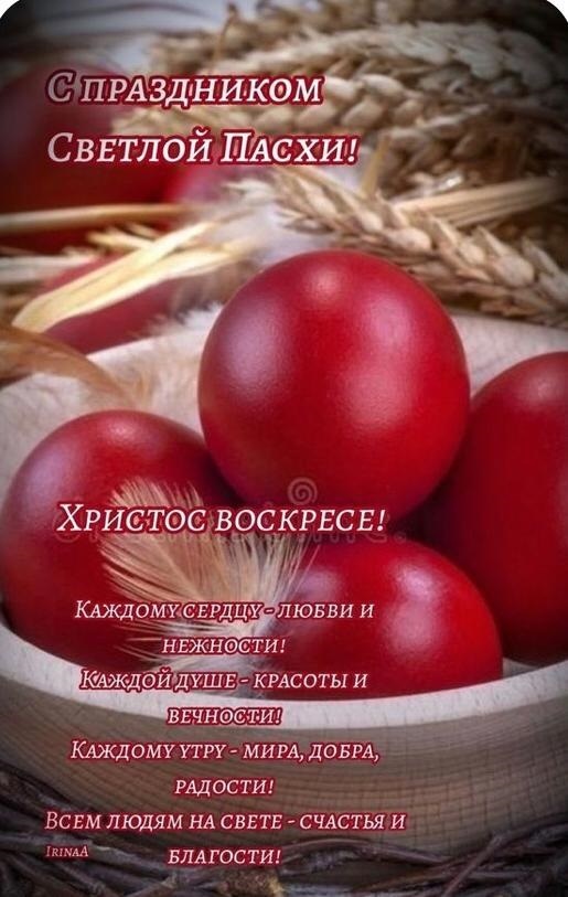 Дорогие друзья! Примите мои поздравления с Великим Светлым Праздником Пасхи, торжеством жизни над смертью! Пусть в Ваш дом придет мир и любовь, сердца наполнятся счастьем и радостью! Хорошо, когда в этот день собирается вся семья. Это очень важно, когда рядом родные и любящие Вас дети и внуки! Приятно собраться всем вместе за родительским столом, порадоваться за здравствующих, всплакнуть по усопшим... Эта Пасха особенная. В этом году совпали и православная, и католическая, и еврейская Пасха, что дает верующим надежду на будущее-общая дата Пасхи может стать началом чего-то значимого. Конечно, мы хотим мира, чтобы наши дети и внуки жили спокойно и счастливо. Это самый длительный по времени праздник- православные празднуют Пасху 40 дней, до 29 мая-день Вознесения Господня. Все эти дни уместно приветствовать друг друга словами "Христос Воскресе!", печь куличи, красить яйца, но самая главная традиция Пасхи-это пасхальная благотворительность. Корзины с пасхальными угощениями посылали в при