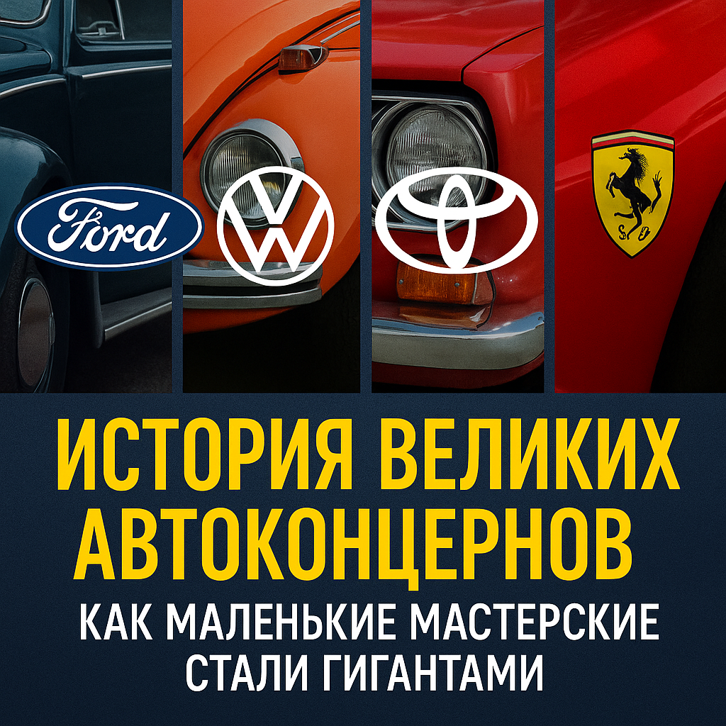 Сегодня сложно представить мир без автомобилей. Они повсюду — от небольших деревень до мегаполисов. Но знаешь ли ты, как рождались крупнейшие автоконцерны, и почему у каждого из них — уникальная история? Давай заглянем в прошлое. В начале XX века Генри Форд изменил всё. Он не придумал автомобиль — он придумал, как сделать его доступным для миллионов. В 1908 году появился Ford Model T — простой, дешевый и надёжный. Но главное — Форд внедрил поточный конвейер. Это позволило сократить время сборки с 12 часов до 1,5. В 1920-х каждый третий автомобиль в мире был Ford. Урок от Ford: Иногда не продукт, а способ его производства делает тебя великим. История VW началась в 1930-х в Германии. Идея: создать машину для народа (Volkswagen в переводе — «народный автомобиль»). Так появился легендарный Жук — Volkswagen Beetle. После Второй мировой VW возродился, благодаря инженеру Ивану Хусту и британской администрации. Beetle стал символом восстановления Германии и свободной Европы. Урок от VW: Даже в