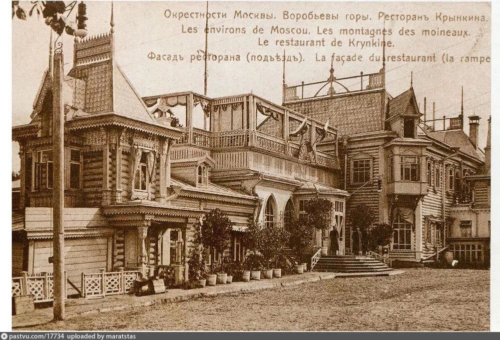 🖇Утраченная Москва: ресторан Крынкина на краю Воробьевых гор 🔵Крынкин открыл трактир в 1891 году в небольшой избе, но постепенно помещение увеличивалось и разрослось до большого ресторана. 🔵Новое здание ресторана построили в 1903-1904 годах по проекту И. Иванова-Шица. Однако история ресторана трагически закончилась после революции 🔵Здание отобрали и отдали под библиотеку. Вскоре оно сгорело. Есть легенда, что дом сжег сын бывшего хозяина ресторана. Московские истории 🎞️ Лучшие места и истории 👈🏻