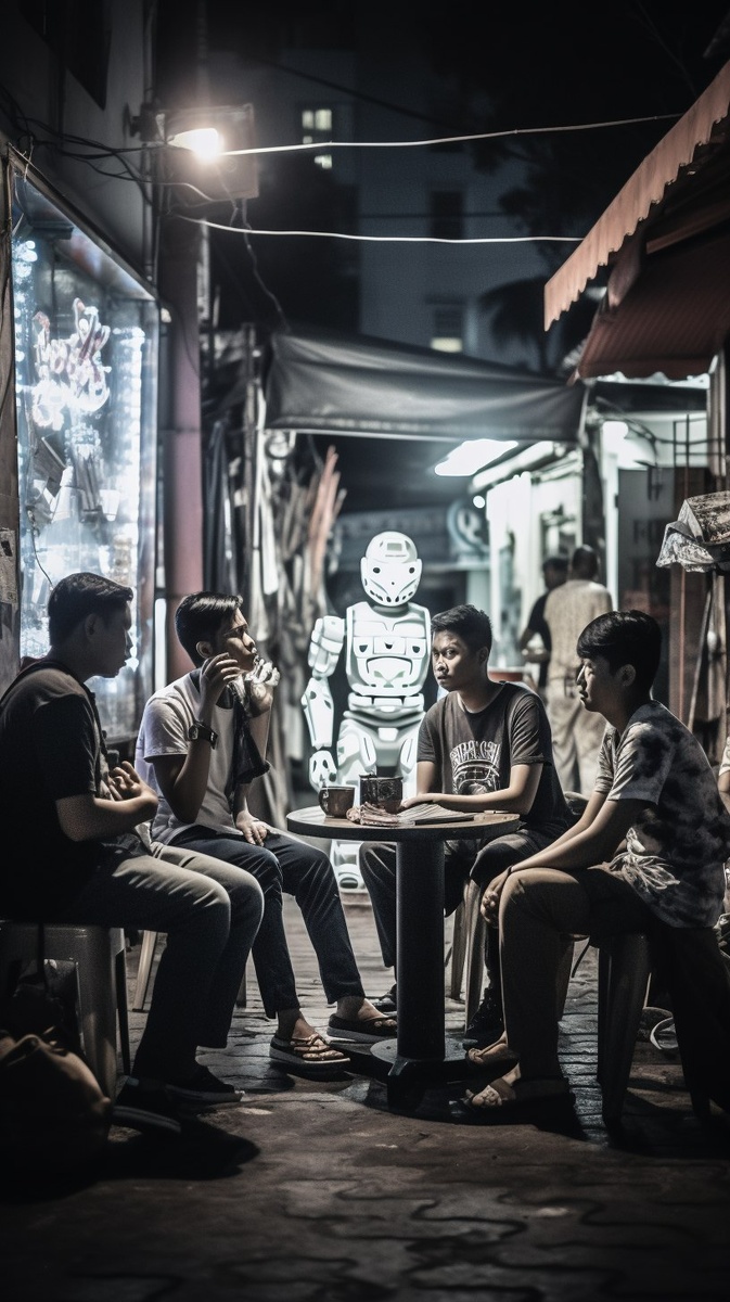 Создано на основе запроса: group of young Indonesian men sitting on plastic chairs, laughing and drinking tea, a humanoid robot sitting