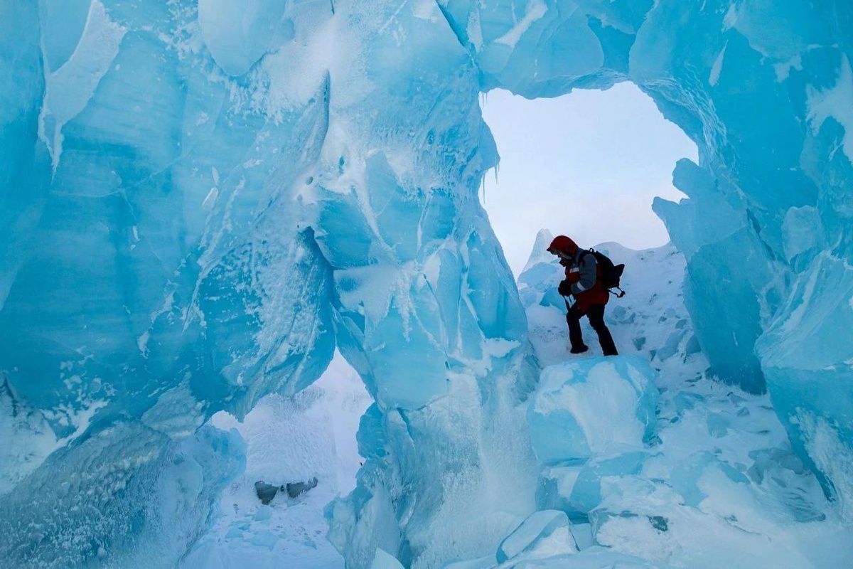 ЛЁД — ЭТО НЕ ПРОСТО ЛЁД! И ПОЧЕМУ ОН СИНИЙ? Часть 2. А мы, съёмочная группа, продолжаем снимать процесс работы и, конечно, формы льда айсбергов, которые здесь «живут» с прошлой осени, когда они приплыли в бухту недалеко от базы нацпарка «Русская Арктика», отколовшись от какого-то ледника на островах архипелага. Когда подходишь к нему, поражают две вещи: размер и форма (он — огромный! Многотысячная, неповторимо устроенная глыба льда!), и он очень синий! Мы в обычной жизни не видим такого синего льда — а почему? Потому что синий цвет, который имеет кристалл льда, возникает из-за свойств воды поглощать красный, и отражённые изнутри или на просвет лучи белого света кажутся синими. Но молодой лёд наполнен пузырьками воздуха, и отражение в нём затруднено, а старый, многотысячелетний лёд ледников — это как бы чистый кристалл, без каких бы то ни было вкраплений: чем более древний, тем более выдержанный («чистый»). Но научная ценность айсбергов как палеоархивов мала (зато они потрясающе крас