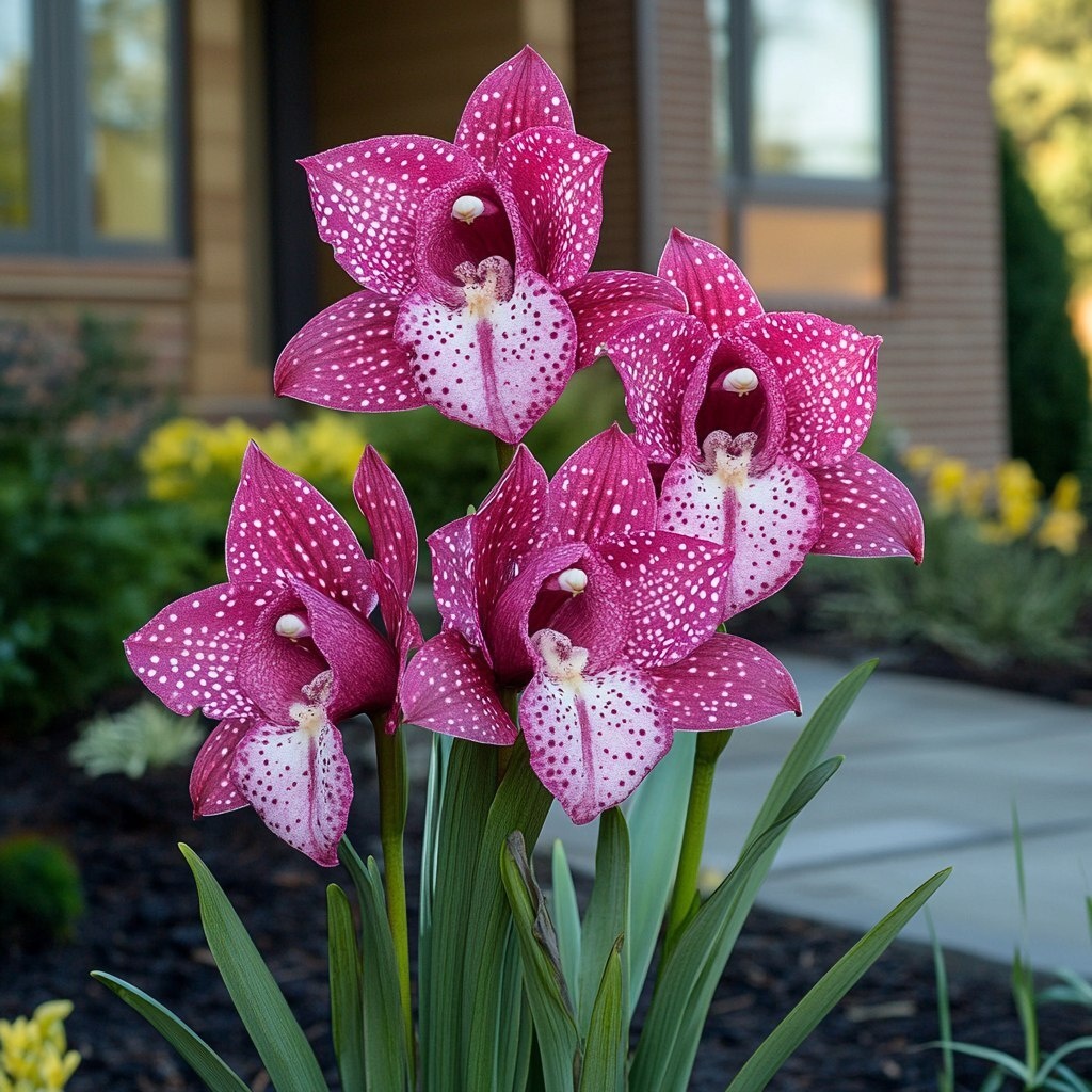 Создано на основе запроса: A realistic flowerbed in front of a cozy suburban house, planted with stunning raspberry-colored orchids with