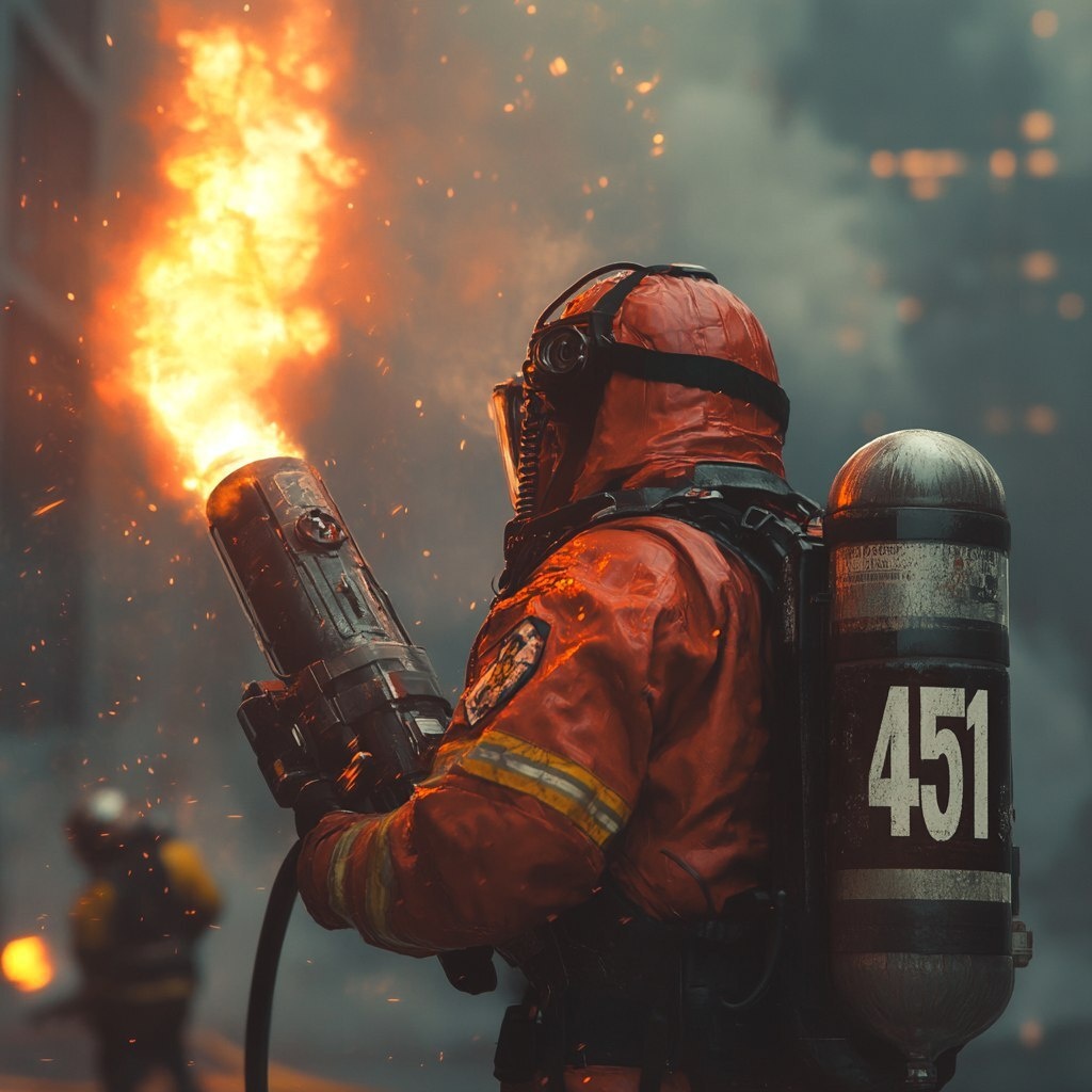 Создано на основе запроса: a firefighter with the number 451 on the back and a modern flamethrower pointing up